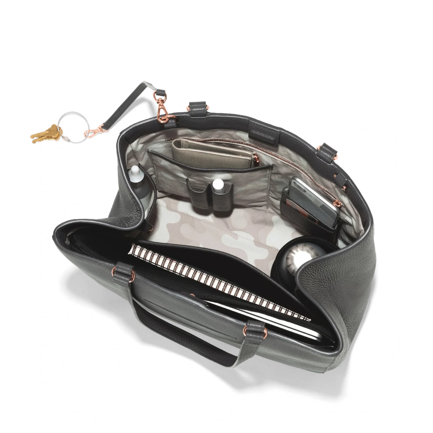 Meet the elevated upgrade to our signature tote. Inspired by late nights at the office and impromptu weekend adventures, the Allyn Tote in dark grey will elevate your style as fast as you can grab your phone from the exterior slip pocket. While the magnetic tab closure gives you more space when you need it, the interior snap fastener provides additional security and an alternative way to carry. A neoprene laptop sleeve and bottle holder ensure your things are always protected, while thoughtful interior pockets keep everything organized and ready to go.