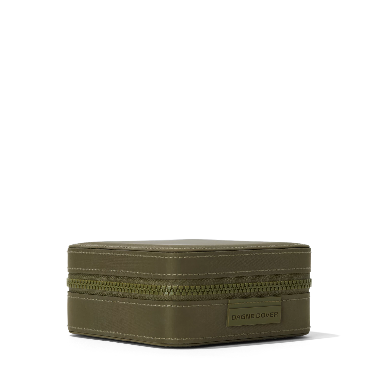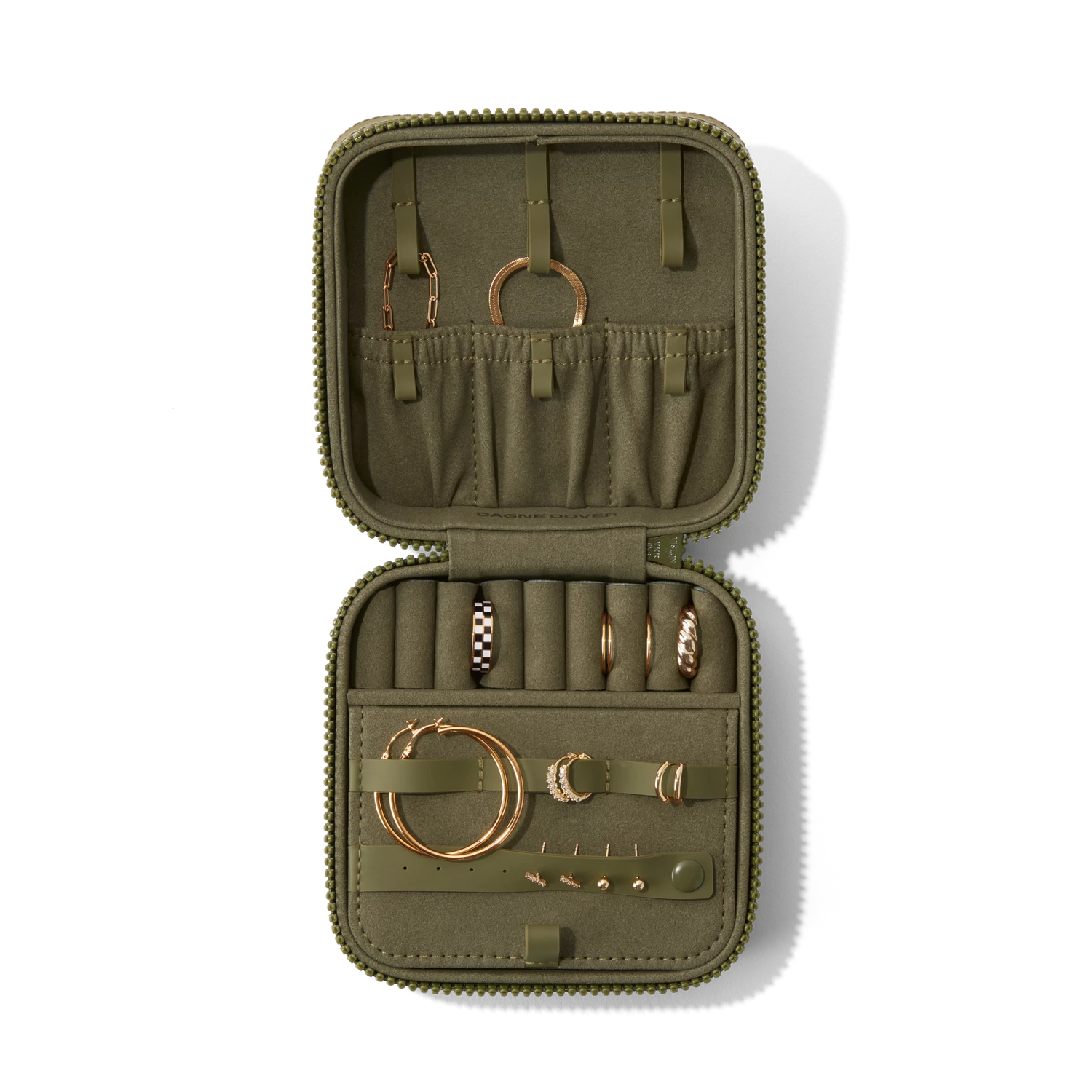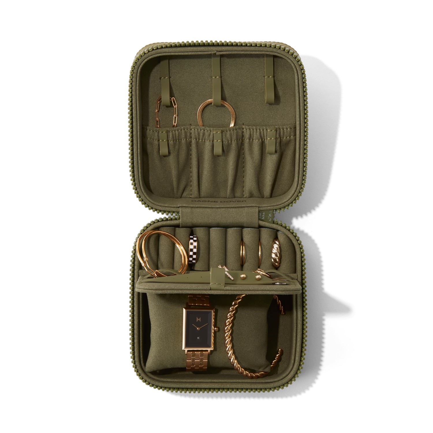 For those times when you travel and don’t want to leave your shine behind. Meet the Large Frankie Jewelry Case in Dark Moss. With a soft, microfiber-lined interior featuring smartly designed loops, straps, and slots, this zippered jewelry travel case keeps your favorite pieces in place, protected, and artfully organized. Lightweight and light on the planet, this eco-friendlier travel jewelry organizer is made with Repreve® recycled polyester created by repurposing 2 plastic water bottles. Features a luxe yet low-key shine. Loves going places, but also feels right at home on your dresser.