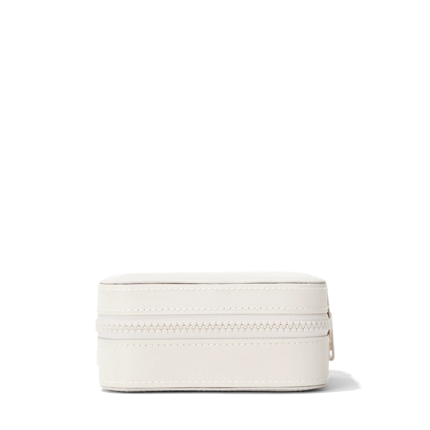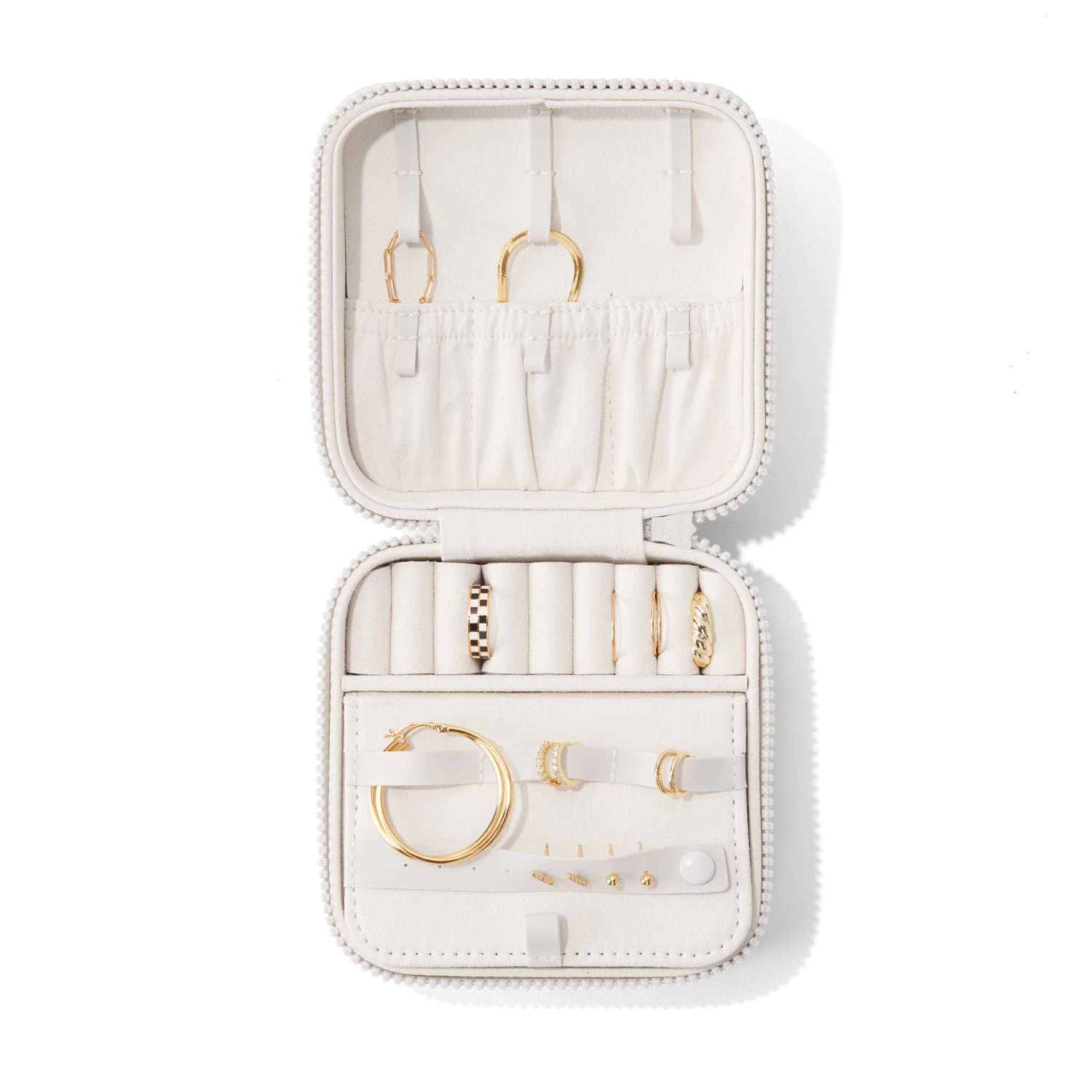 For those times when you travel and don’t want to leave your shine behind. Meet the Large Frankie Jewelry Case in Moonbeam. With a soft, microfiber-lined interior featuring smartly designed loops, straps, and slots, this zippered jewelry travel case keeps your favorite pieces in place, protected, and artfully organized. Lightweight and light on the planet, this eco-friendlier travel jewelry organizer is made with Repreve® recycled polyester created by repurposing 2 plastic water bottles. Features a luxe yet low-key shine. Loves going places, but also feels right at home on your dresser.