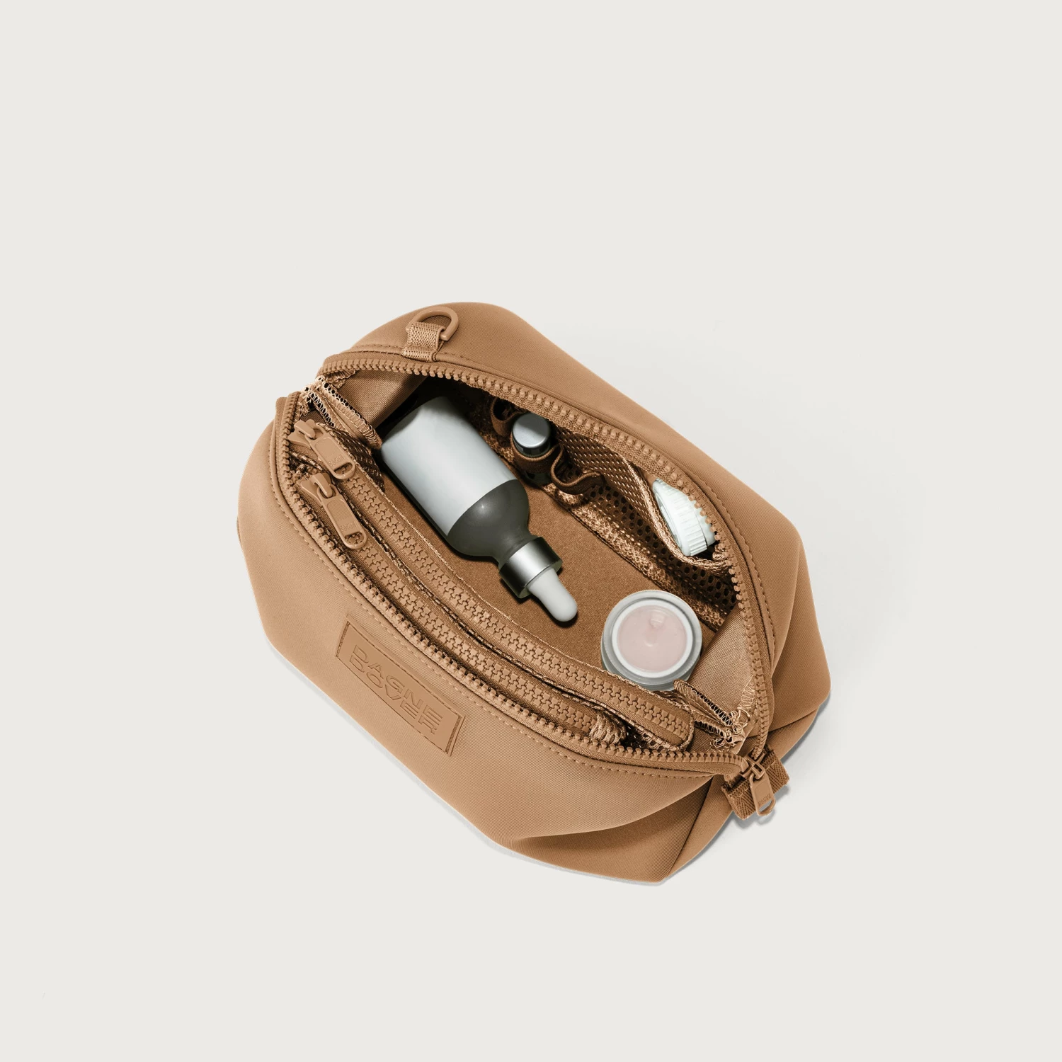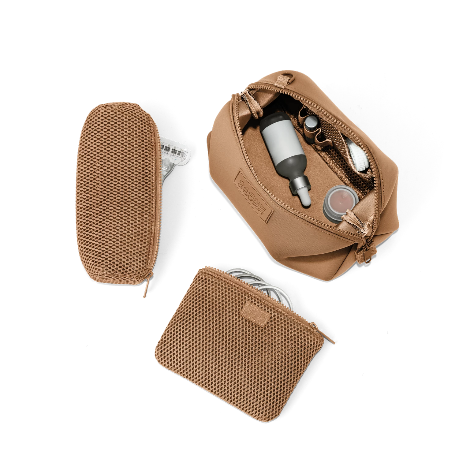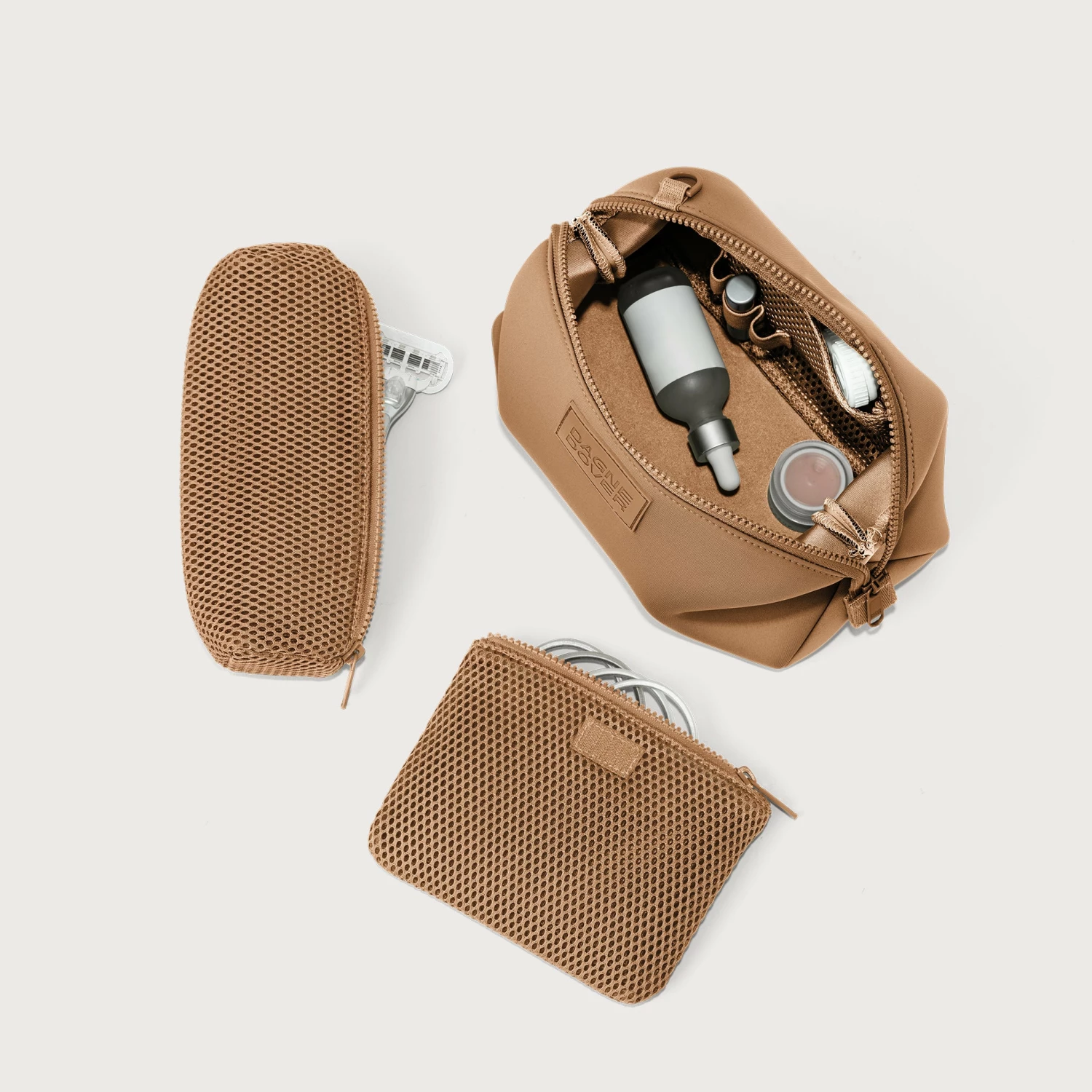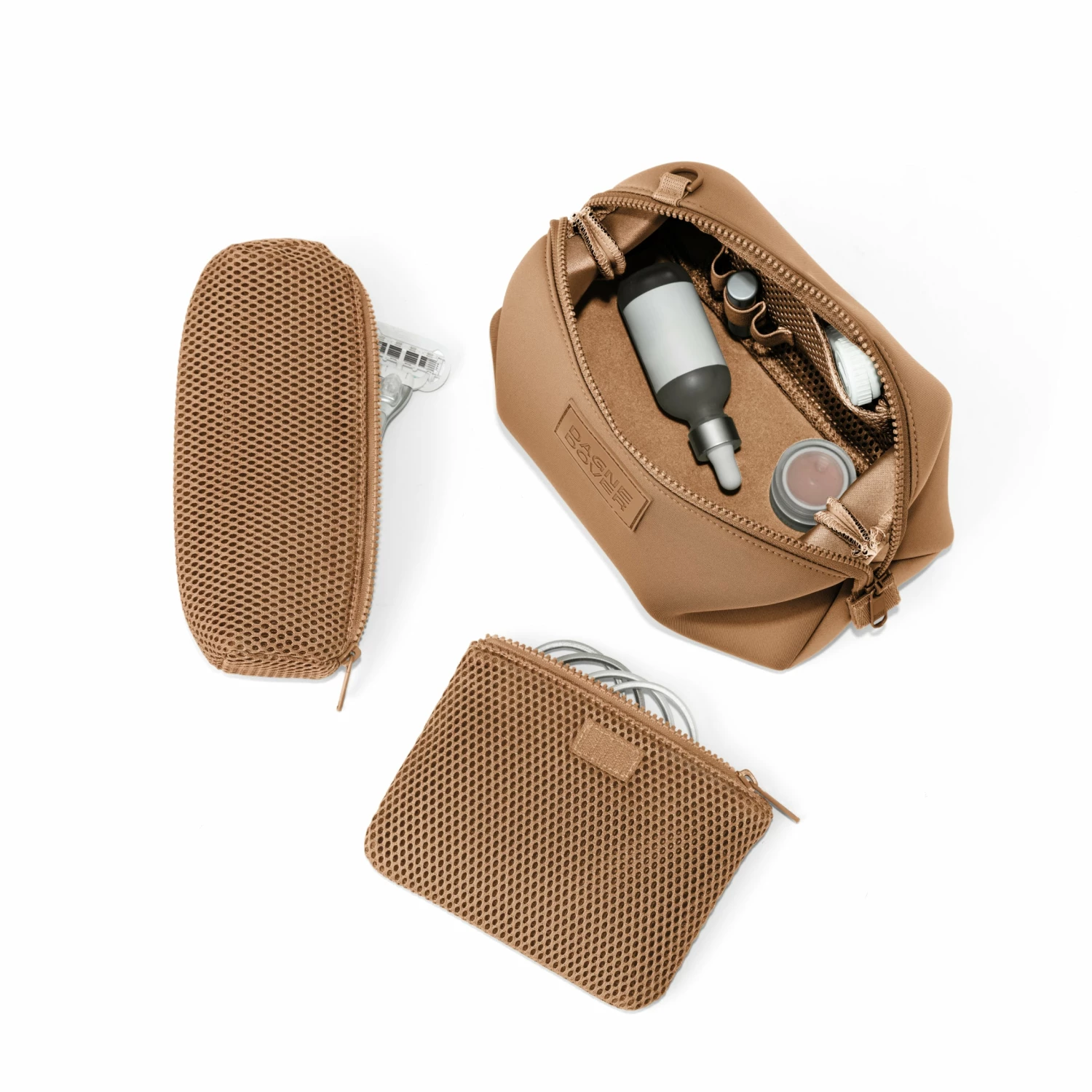 With our Hunter Toiletry Bag in Camel, you can keep your grooming essentials perfectly organized. In addition to a removable zippered interior pouch for your toothbrush, contact lens case or comb, the larger iteration is complete with a side slip pocket and detachable air mesh brush pouch. Elastic loops cradle items like lip balm, razors or travel fragrance, and the extra volume inside provides enough space to easily contain TSA-sized moisturizers, shampoo and shower gel.