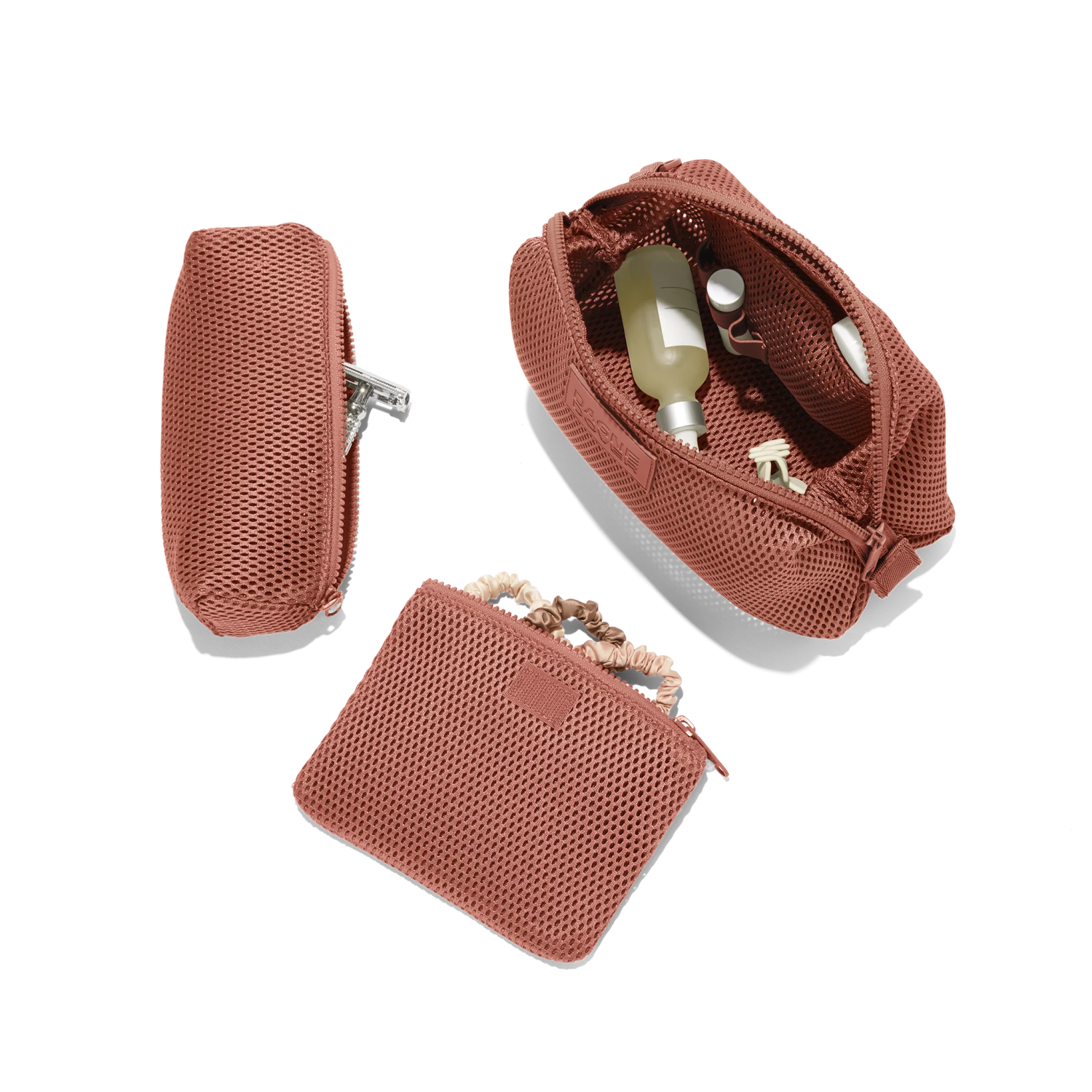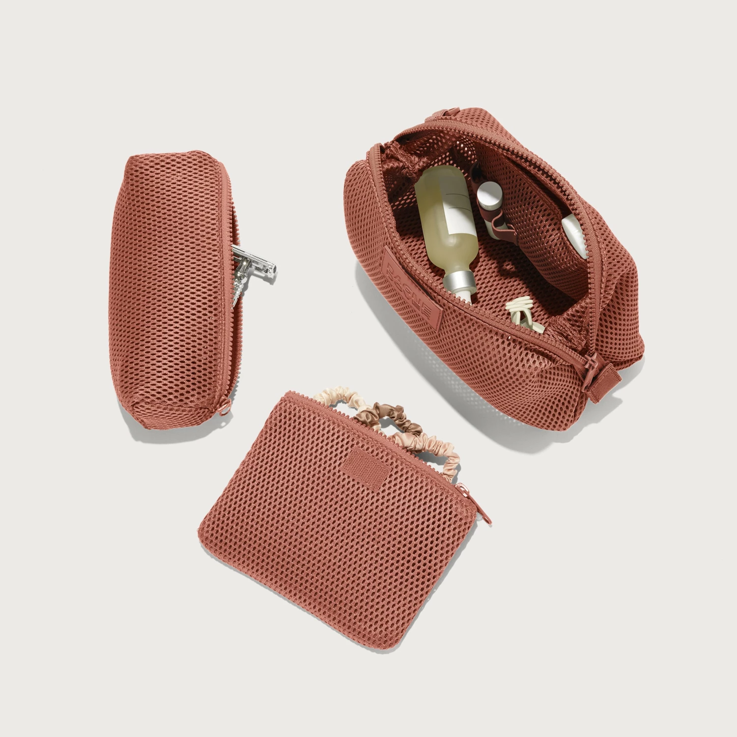 Keep daily essentials organized in this recycled Air Mesh shower organizer. Lightweight and breathable, this large toiletry pouch is made to move. With plenty of space for toiletries, you can pop it in your luggage, gym bag, or seamlessly switch it between bags for easy access to necessities anytime. Cushiony and crease-free, it’ll protect your stuff and look good doing it. Smartly designed with a removable zippered compartment and side slip pocket for items like a small comb, contact lens case or tissue packet. Interior elastic loops wrangle items like lip balm, cords, razors or travel fragrance for an organized on-the-go experience.
