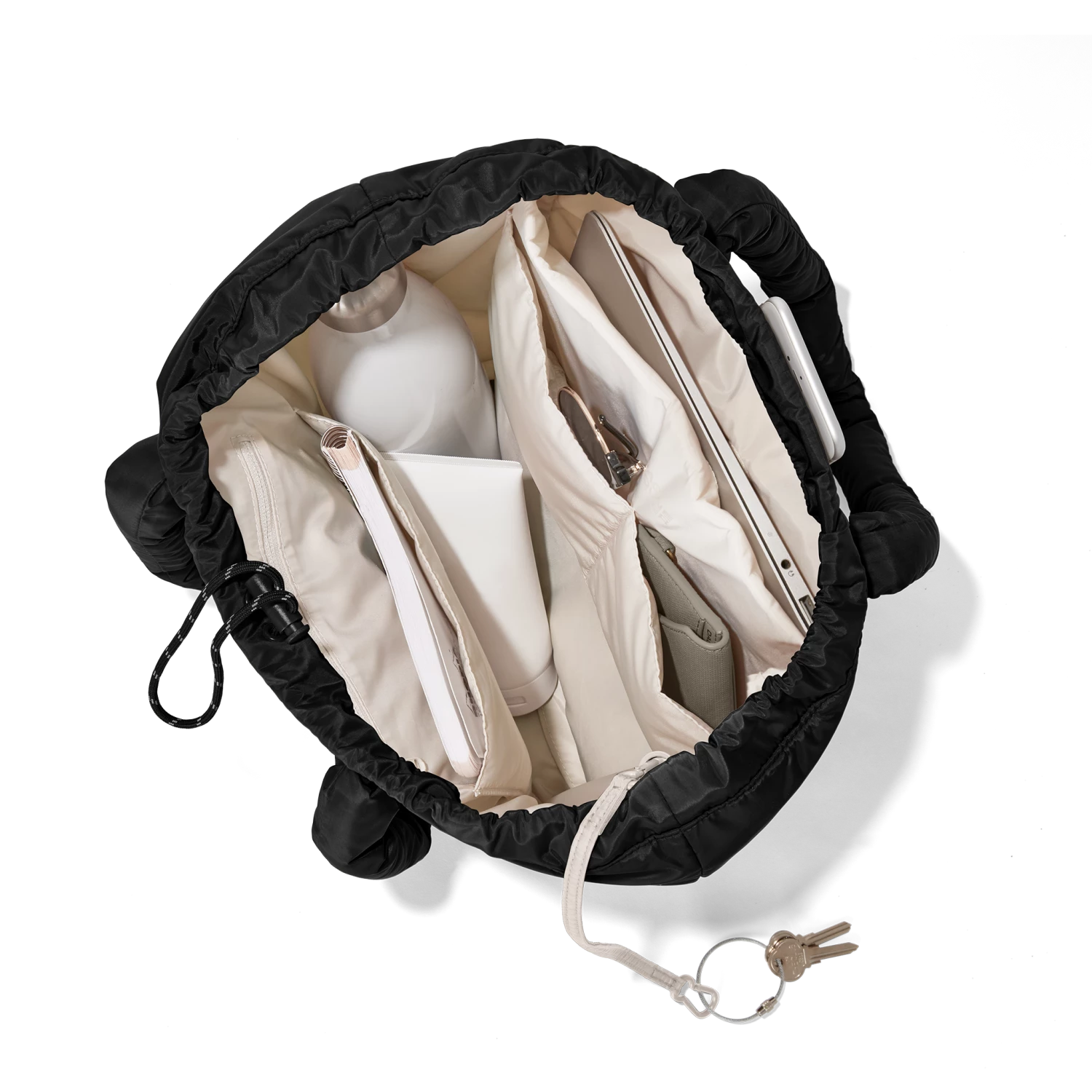 Meet the love child between a drawstring bag and a puffy tote. This lightweight bag opens wide for easy access to all of your stuff, and cinches closed with its drawstring tie. And yes, it even fits a 16” laptop. Take it to the gym, the office, or even the beach (did we mention its a cinch to clean?). Like its cousin, the Kal Drawstring Tote is made from Repreve® (you know, the material made from recycled water bottles). Who wouldve thought a recycled drawstring bag could look this good? (I mean, we had a hunch but were glad our hunch turned out to be true.)