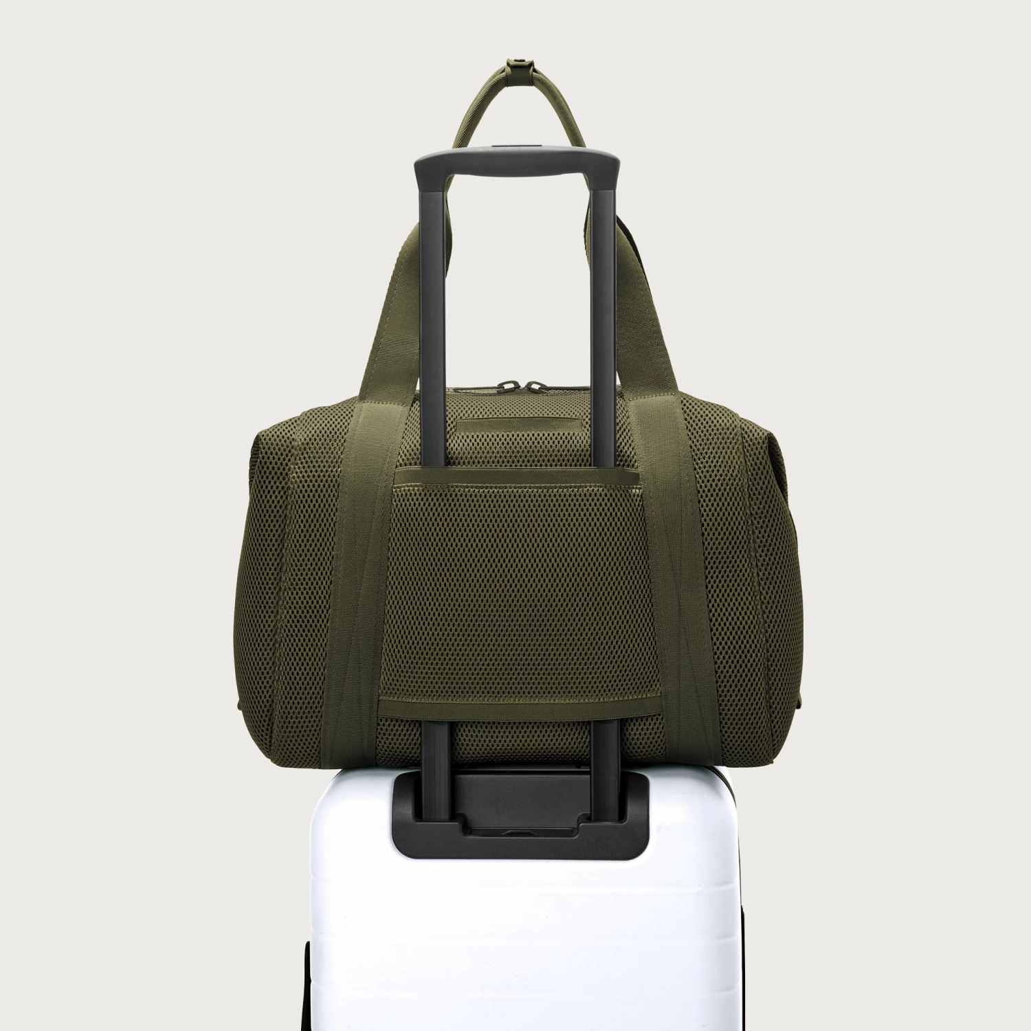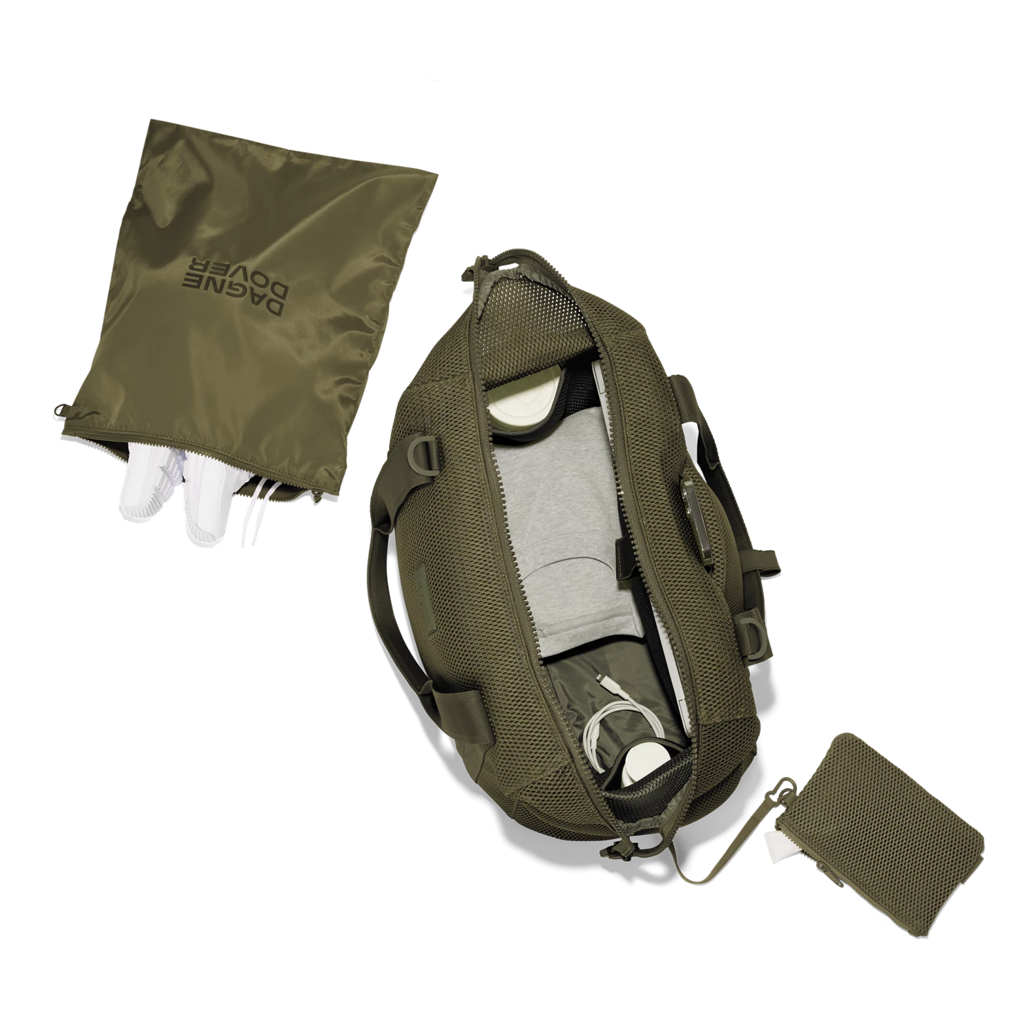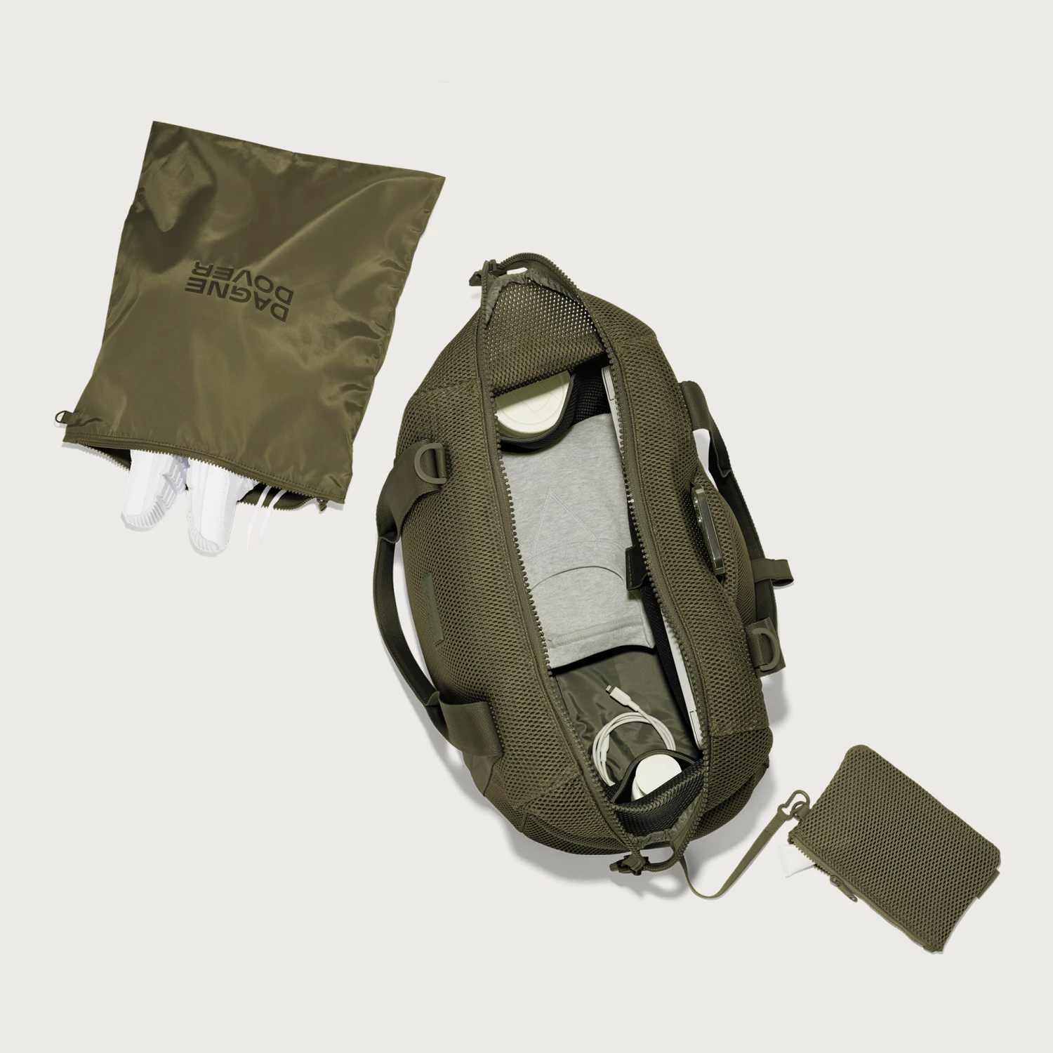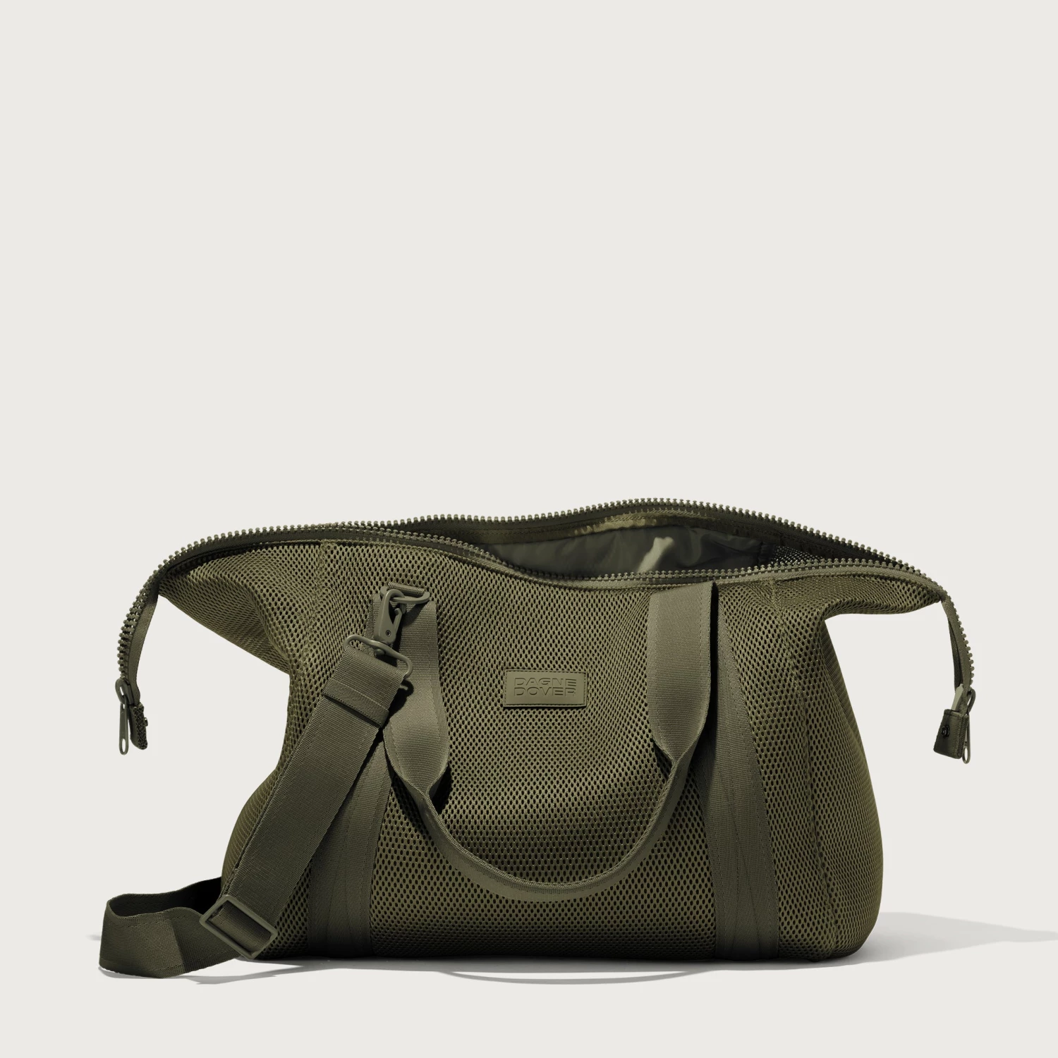 Meet the Air Mesh duffle bag that does it all. Our Large Air Mesh Landon in dark green is made to move with you, all while keeping your stuff safe and secure. It’s cushiony, recycled, and ultra lightweight, making it the ideal duffle for any adventure. With interior pockets, a stretch key leash, a hidden exterior pocket for easy phone or passport access, a padded laptop sleeve, an Air Mesh pouch for all your essentials, and a water bottle pocket, it’s smartly designed to keep you organized everywhere. Add this breathable bag to your travel or gym rotation for the durable duffle of your dreams.