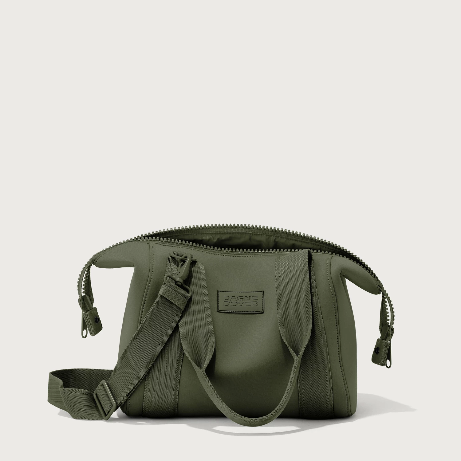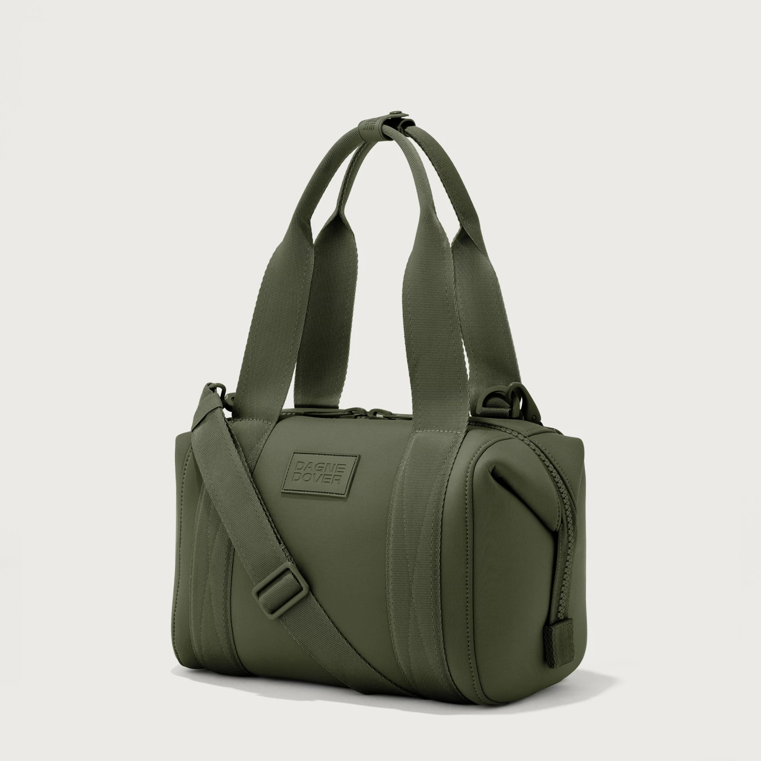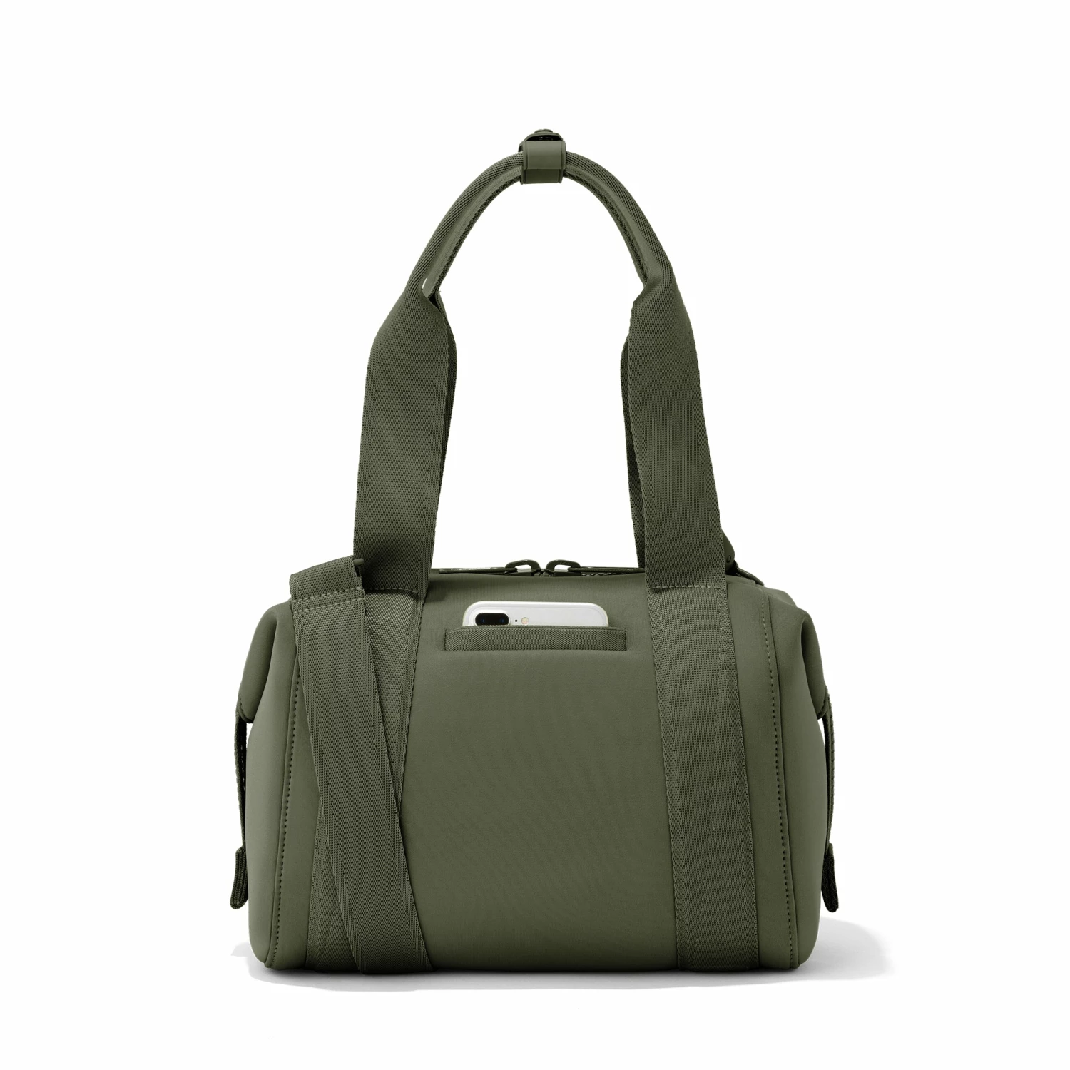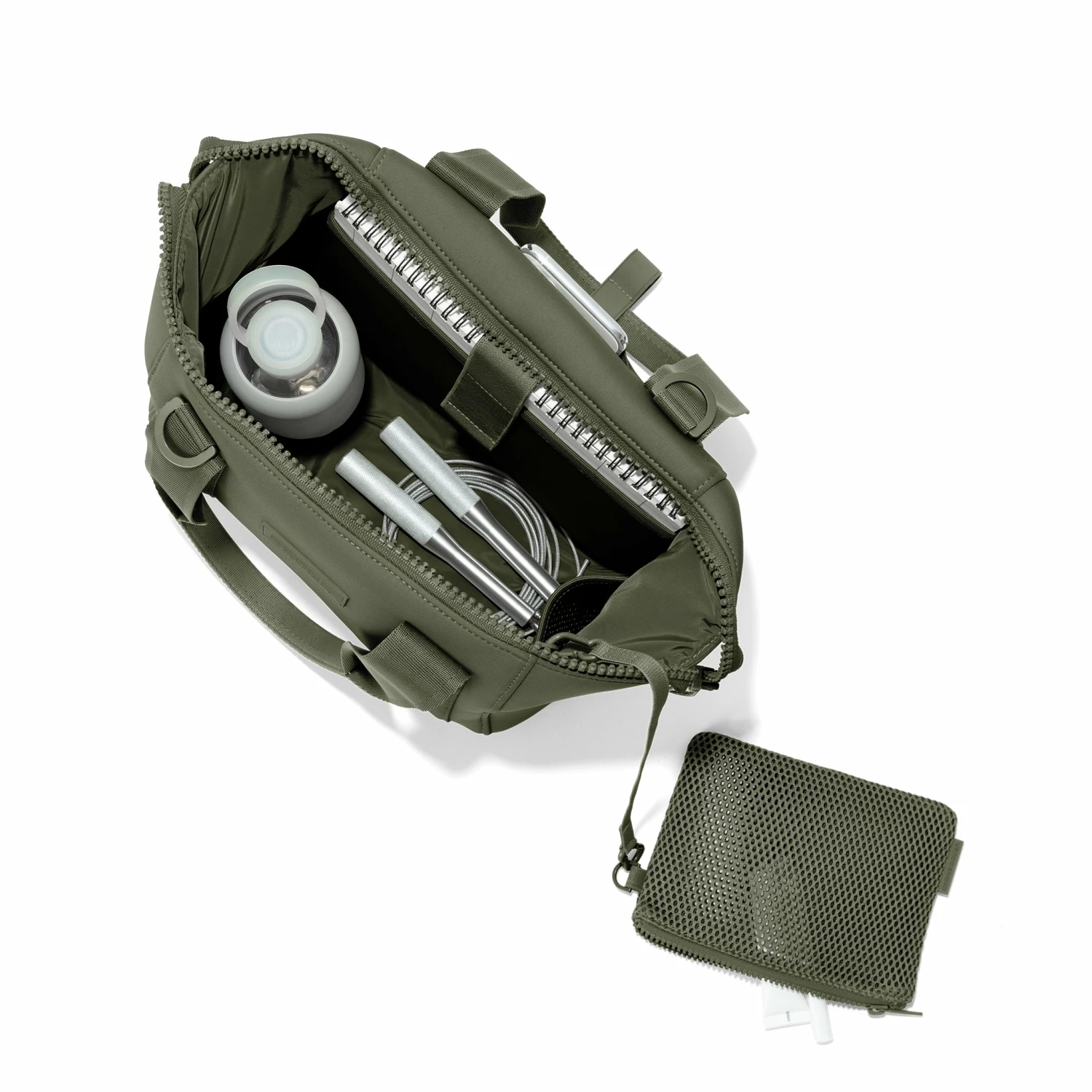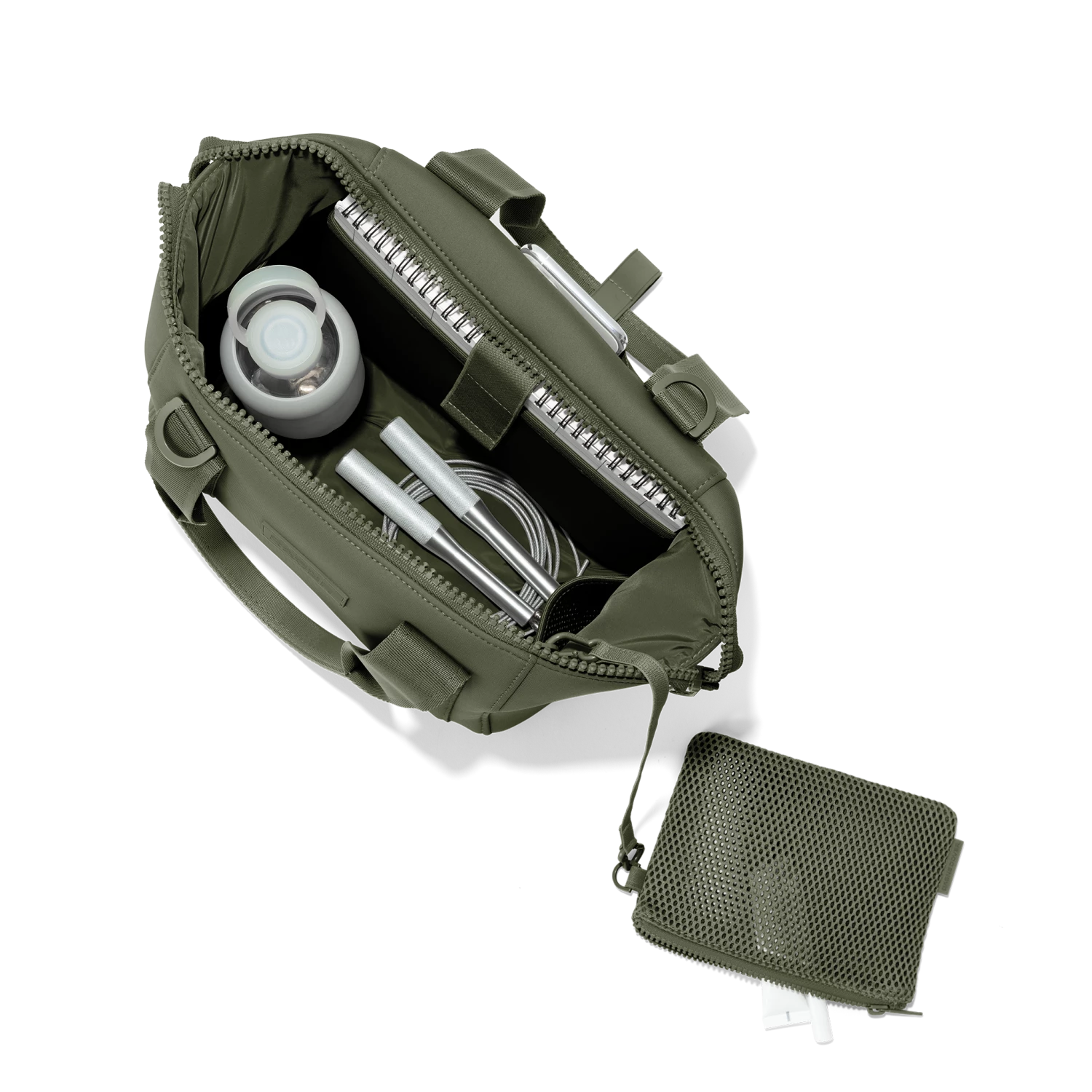 Our small Landon Carryall in microchip green is the ultimate solution to a full day ahead. Its petite size won’t impede on a daily commute and when unsnapped at the sides, has enough space to hold a change of clothes for any post-work activity or to pick up a few things at the farmers market on weekends. The small Landon includes a stretch key leash and practical pockets for a tablet, charging cords and water bottle. A detachable cross-body strap provides more ways to carry it all with ease.