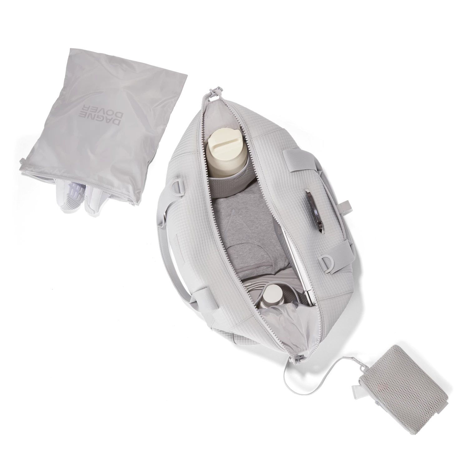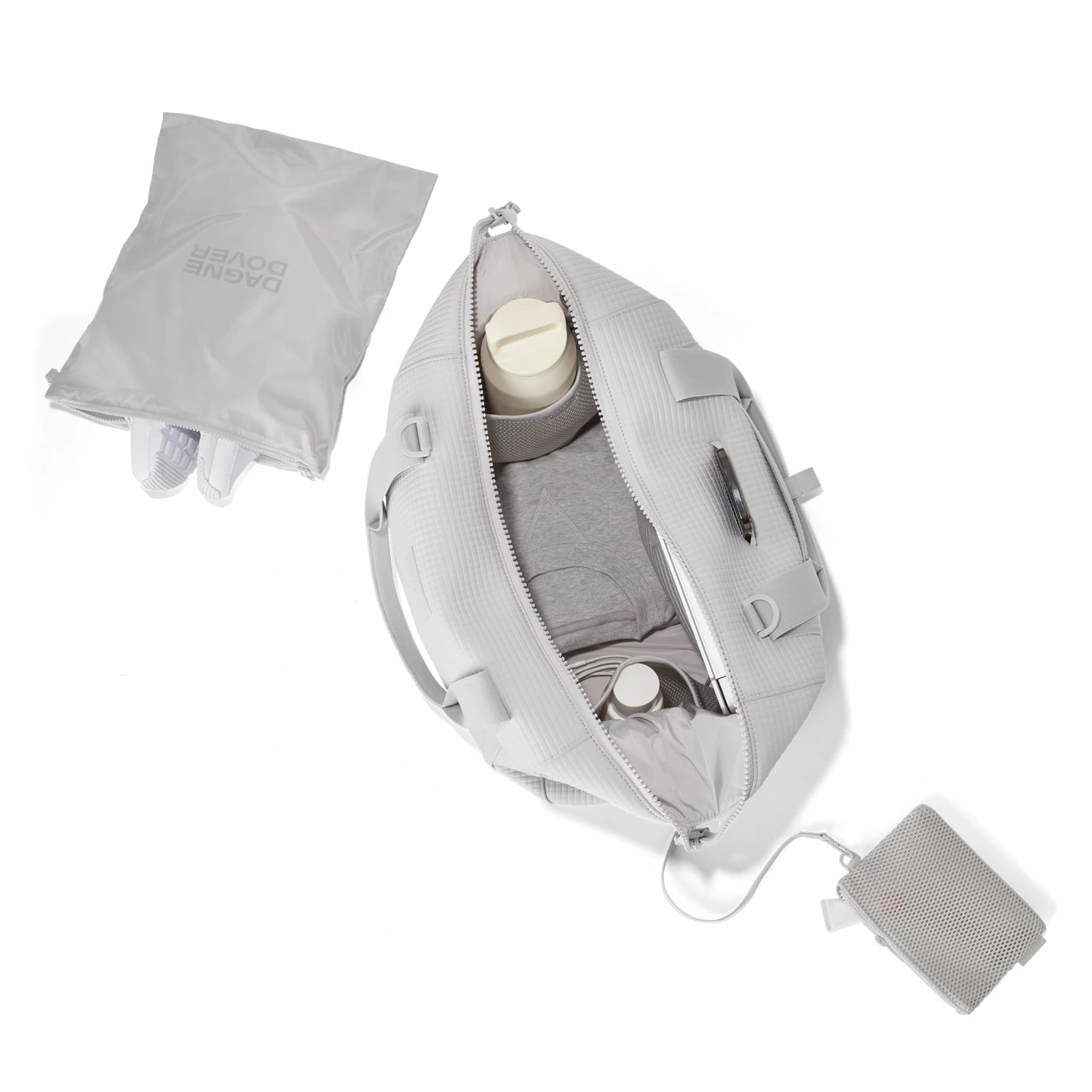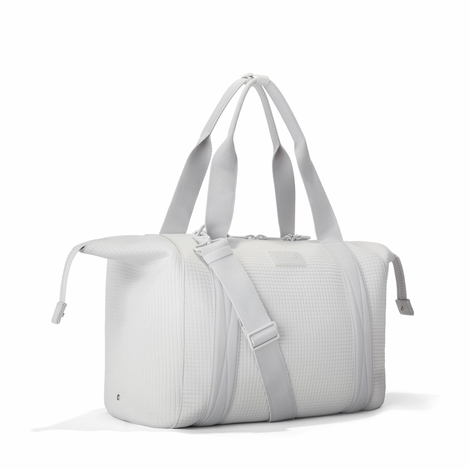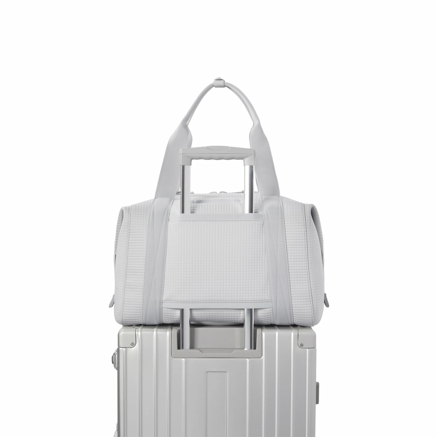 The weekend is nigh and youre ready for a much-needed getaway in light grey. Whether youre off to commune with nature in a cabin by the woods or jetting to Paris for a stylish urban excursion, our large Landon Carryall in Waffle Fog has you covered. This lightweight bag is designed to support you on any journey, modest or immense, and unsnaps at the sides to create more room for any unexpected finds you cant leave behind. It also includes a padded laptop sleeve, an air mesh pouch for all your essentials and a water bottle pocket so you can stay hydrated in-flight or on a hike. A stretch key leash, shoe duster and extra interior pockets are bound to keep you organized, and the handy pocket on the back of the bag is the perfect place to tuck away your passport or phone.