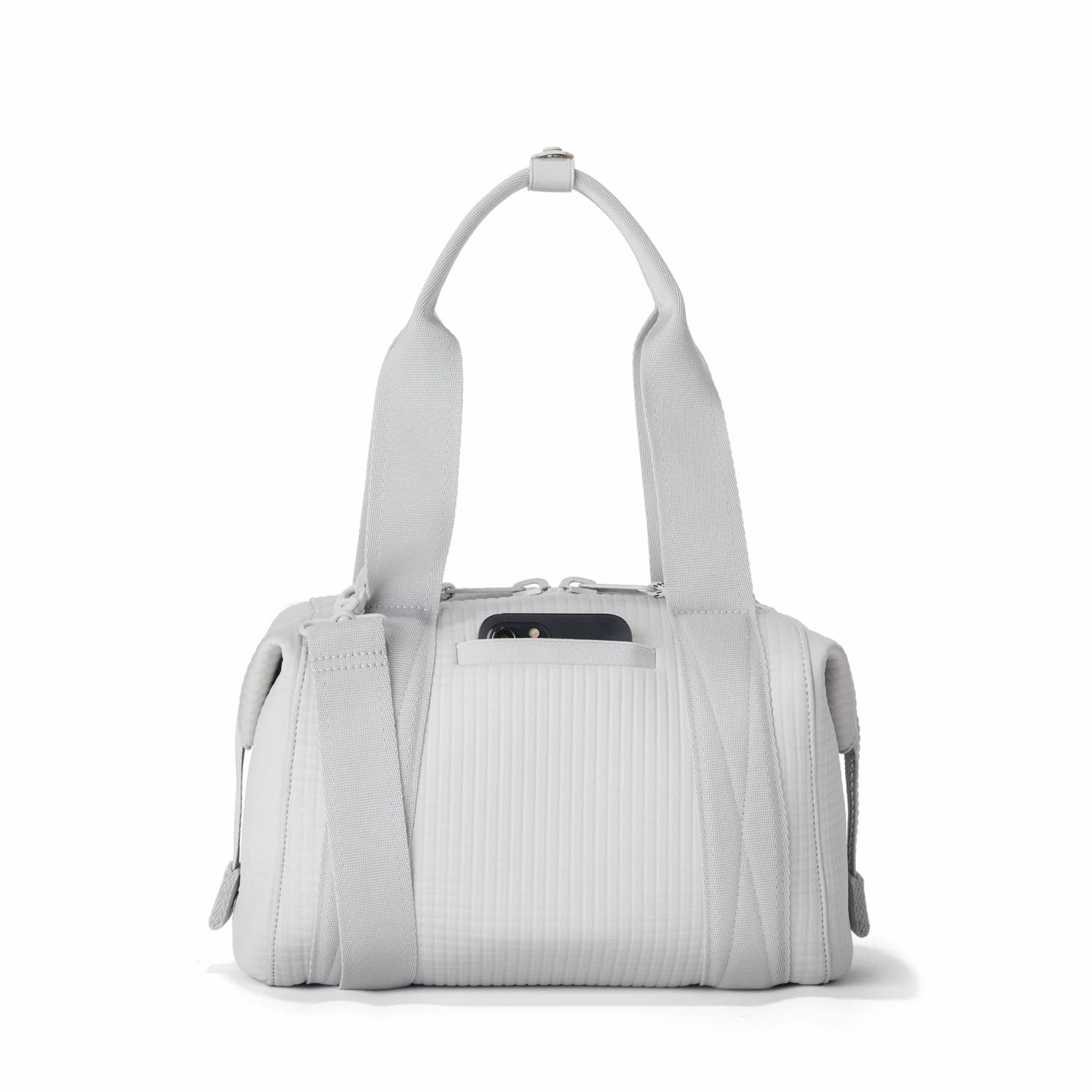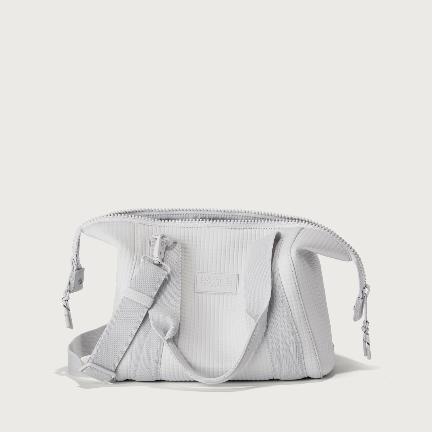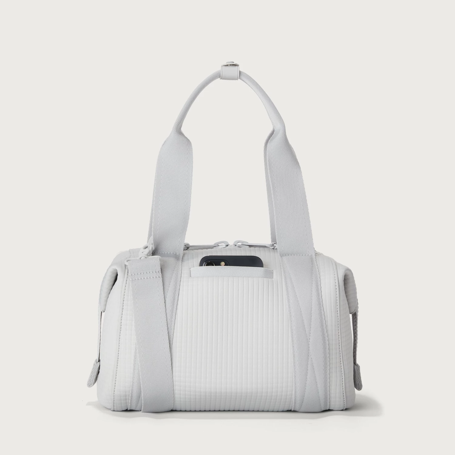 Our small Landon Carryall in Waffle Fog is the ultimate duffle bag for a full day ahead. Its petite size wont impede on a daily commute and when unsnapped at the sides, has enough space to hold a change of clothes for any post-work activity or to pick up a few things at the farmers market on weekends. The small Landon in light grey includes a stretch key leash and practical pockets for a tablet, charging cords and water bottle. A detachable cross-body strap provides more ways to carry it all with ease.