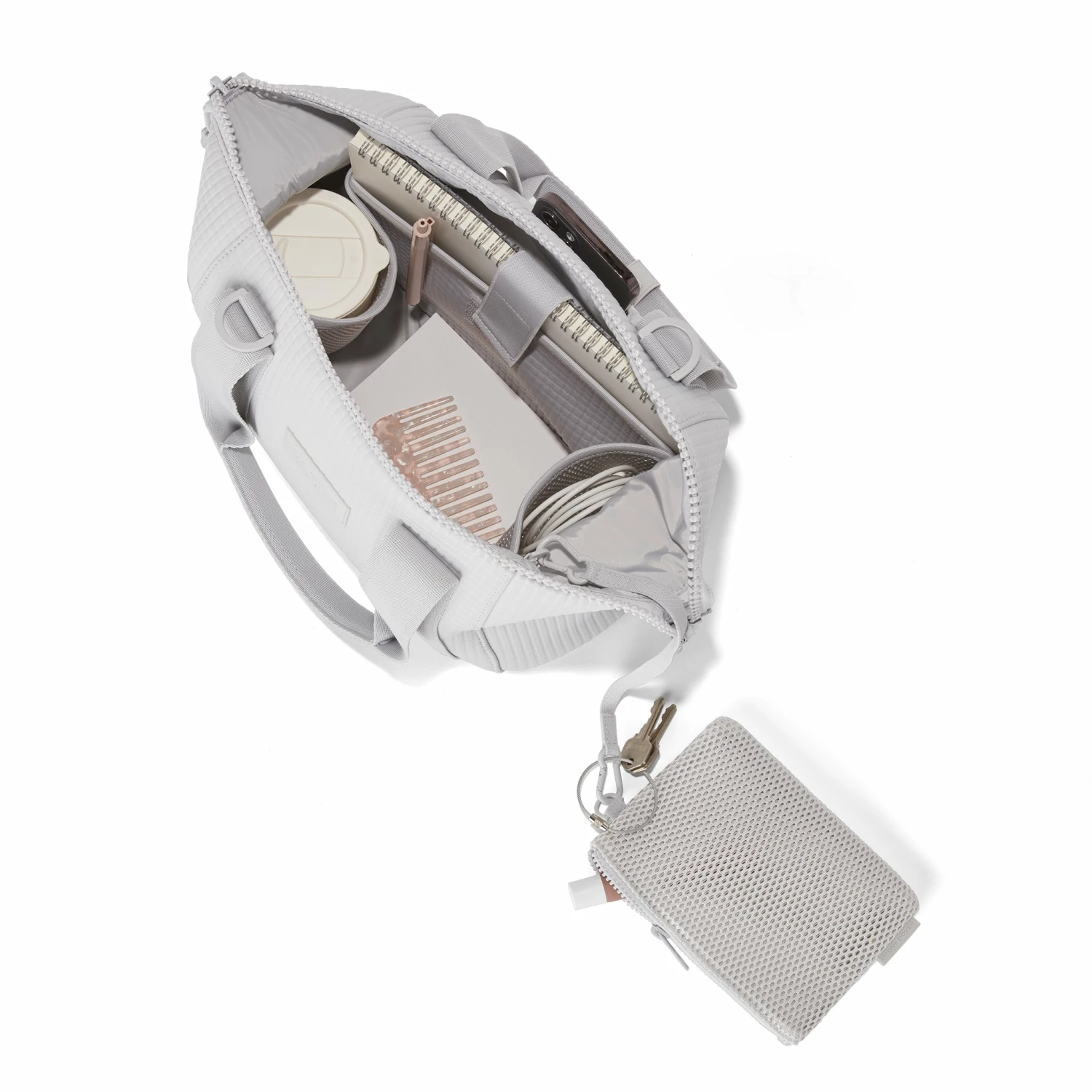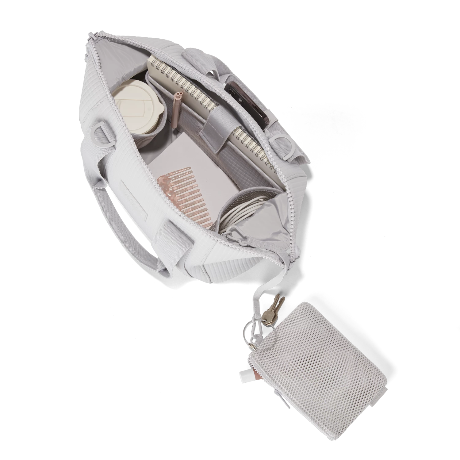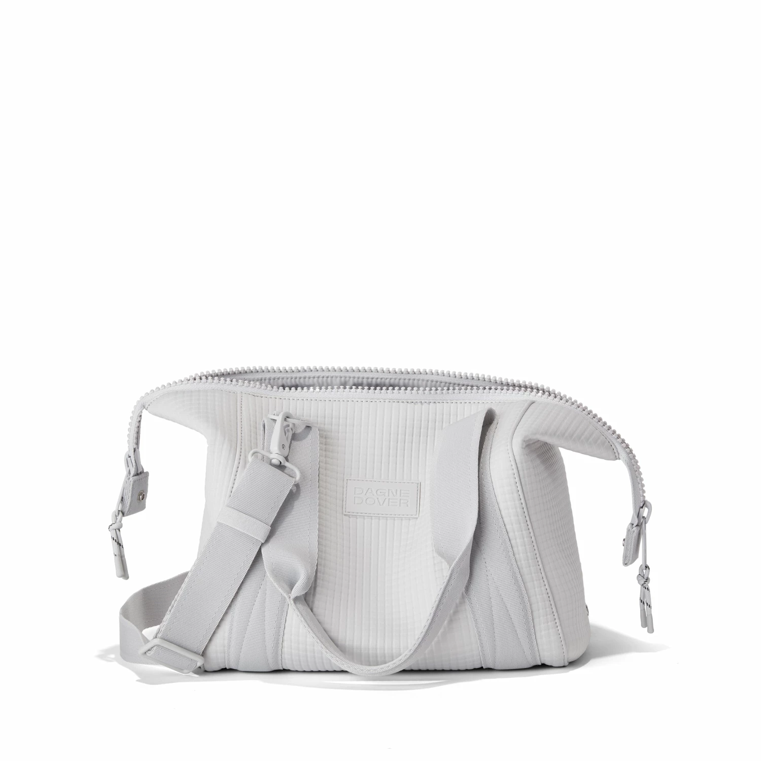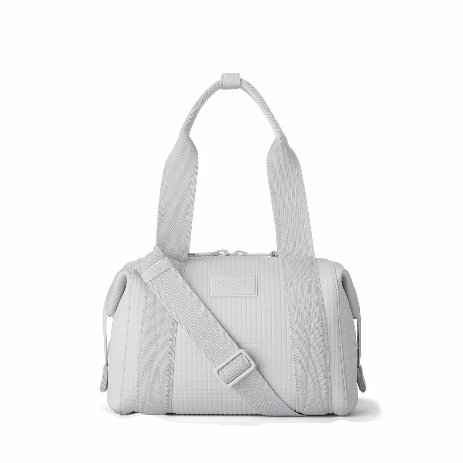 Our small Landon Carryall in Waffle Fog is the ultimate duffle bag for a full day ahead. Its petite size wont impede on a daily commute and when unsnapped at the sides, has enough space to hold a change of clothes for any post-work activity or to pick up a few things at the farmers market on weekends. The small Landon in light grey includes a stretch key leash and practical pockets for a tablet, charging cords and water bottle. A detachable cross-body strap provides more ways to carry it all with ease.