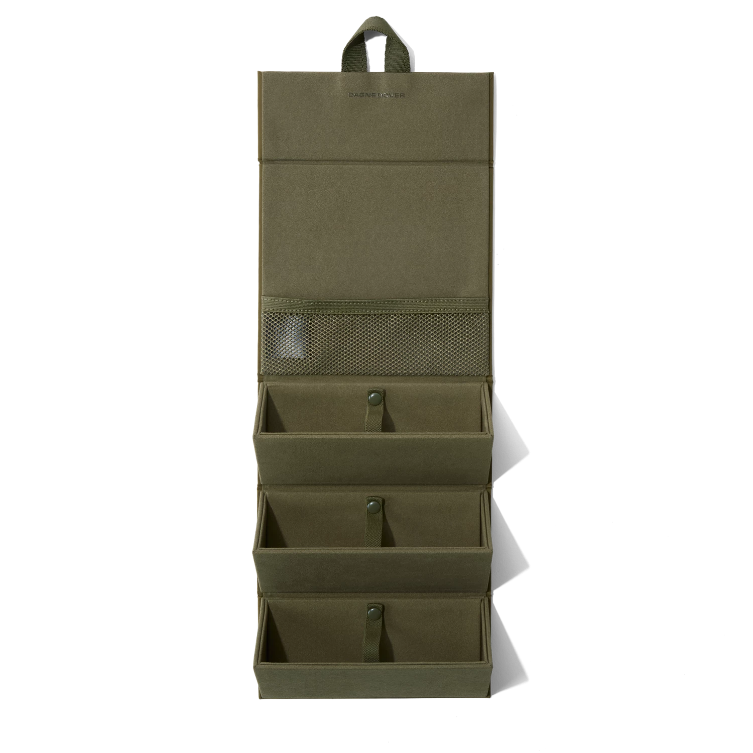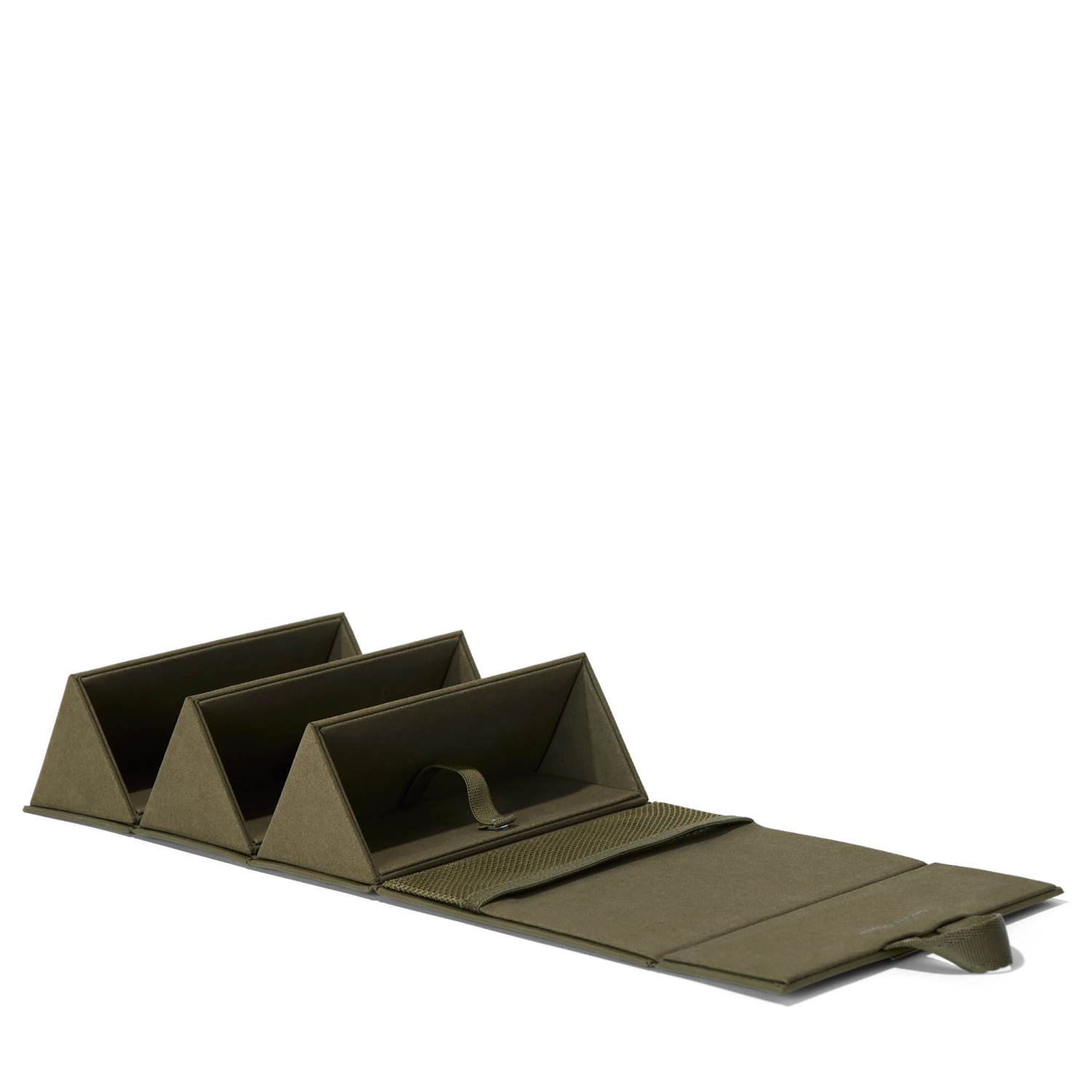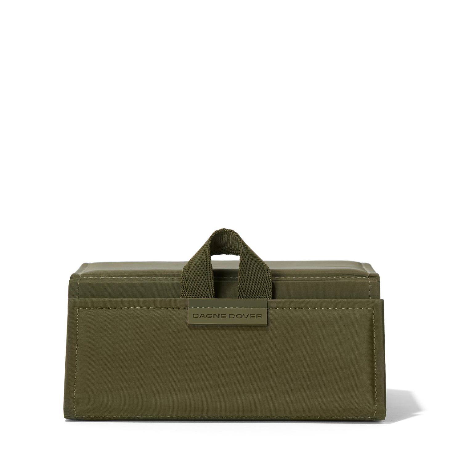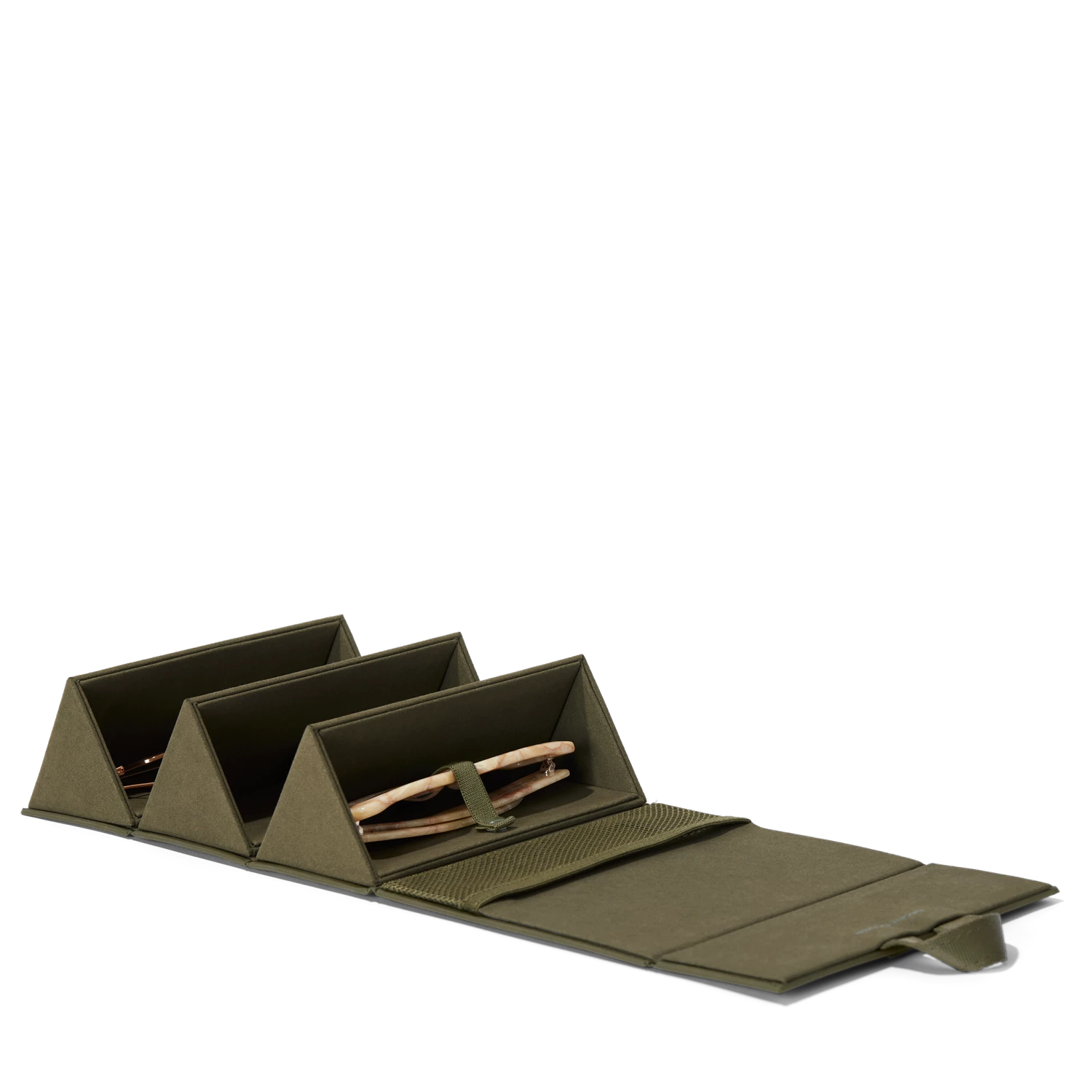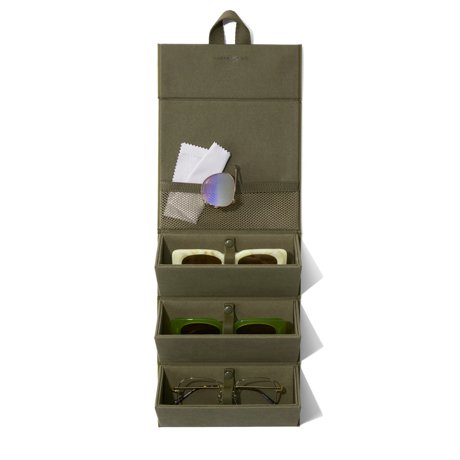 Some moments call for cat eyes, and others are for aviators. The Remi Glasses Case was made for bringing your shades and frames from here to there and back again. This foldable sunglasses travel case features a chic geometric silhouette with magnetic closure that stores up to 3 pairs securely. Skip the scratches with an ultra-soft microfiber lining and elastic straps to keep everything in place. This smartly designed eyeglass holder includes a convenient interior mesh pocket for little extras and a hook for hanging when it’s unfolded. Designed with eco-friendlier Repreve® materials featuring a luxe, subtle shine.