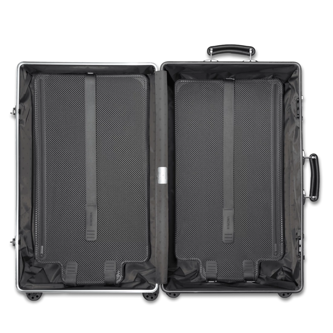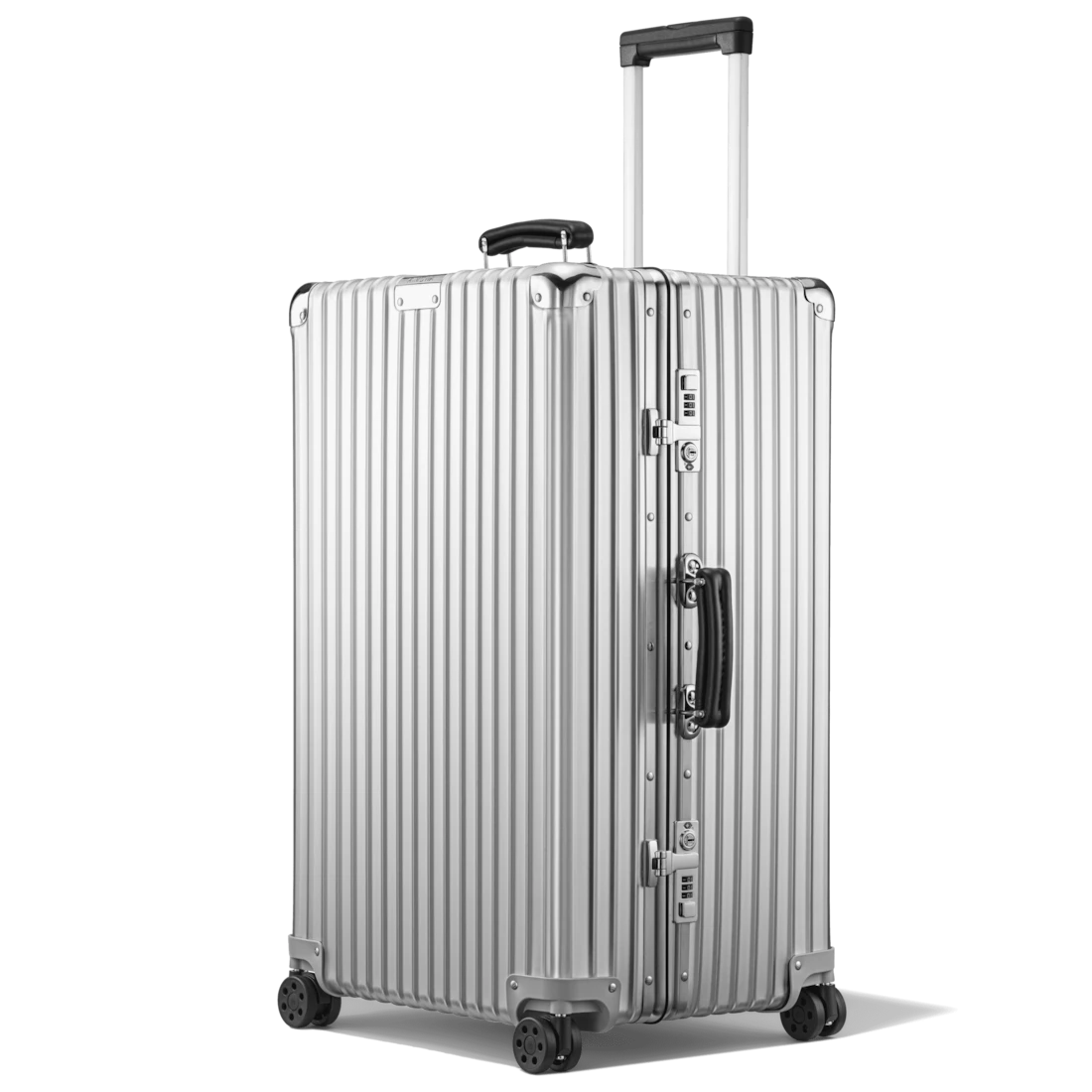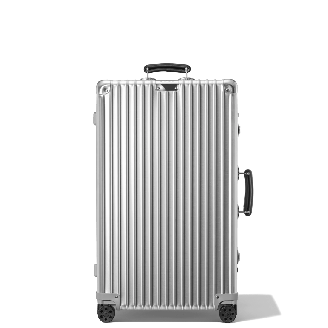 Rooted in heritage, each RIMOWA Classic features a high-end anodized aluminum alloy, riveted high-gloss aluminum corners, and hand-made leather handles. Creating the perfect balance between craftsmanship and superior engineering, this large 4 wheel aluminum suitcase provides enough room for journeys of up to 14 days.