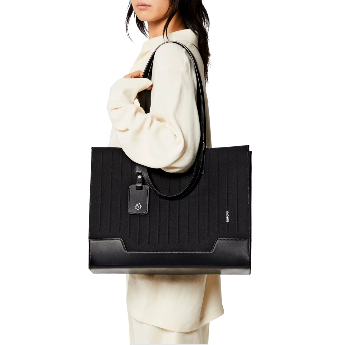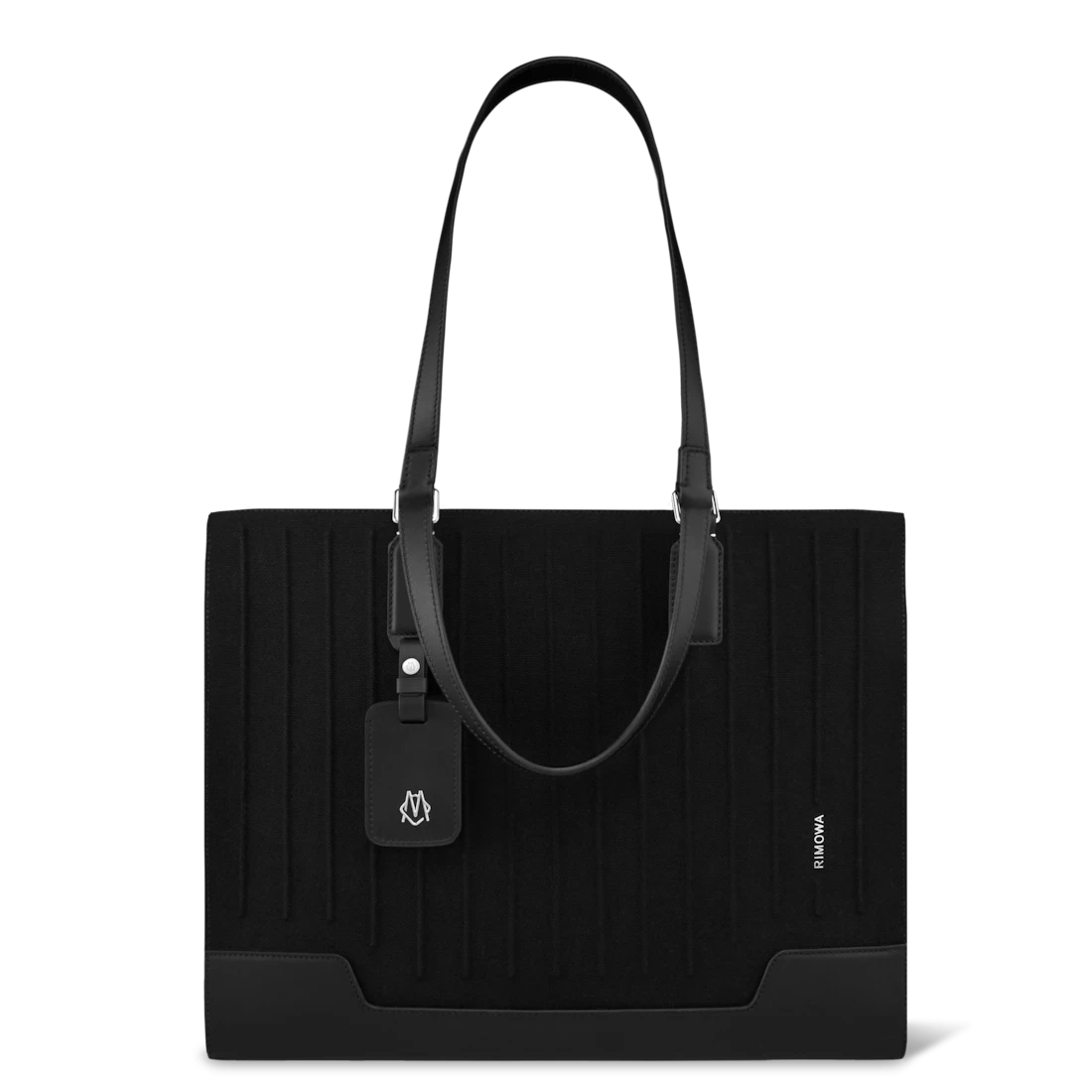 Crafted out of premium materials like durable canvas and full-grain leather, the RIMOWA Never Still Tote Large in Black is ideal for accommodating daily essentials with its roomy compartment and internal zipped pocket. This tote is engineered with an innovative double handle system (short 6.5 in, long 11.4 in) that allows you to choose between wearing the tote as a shoulder or handbag.