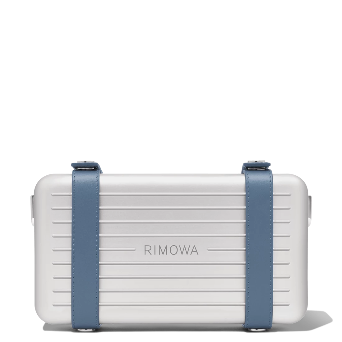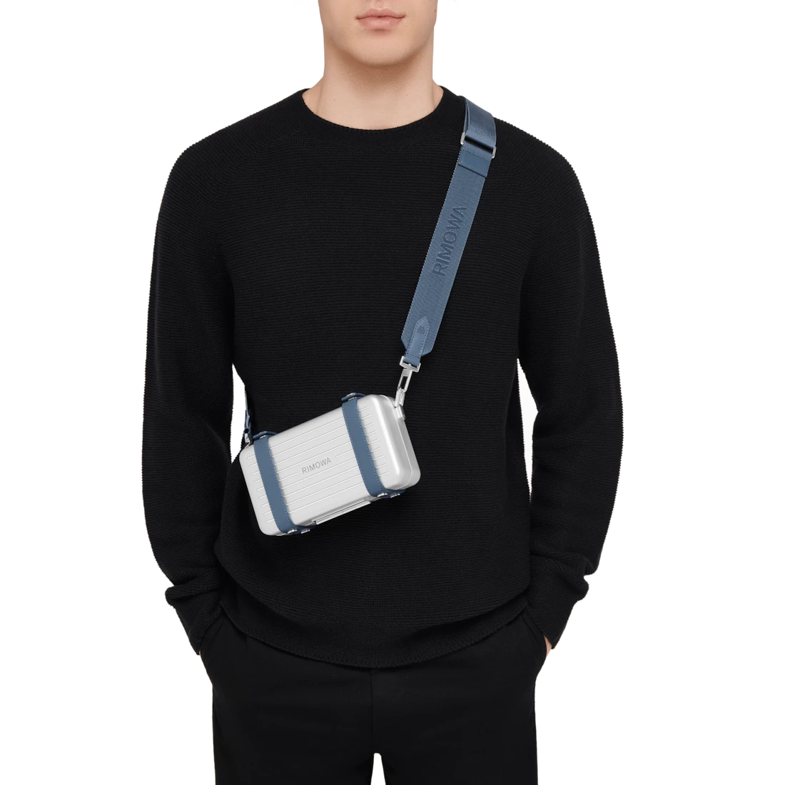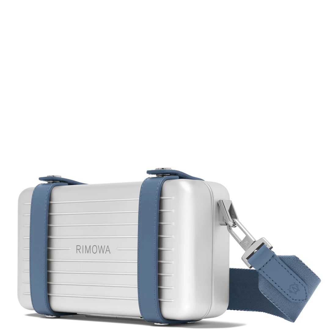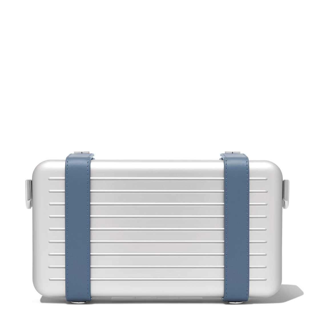 Each detail of the RIMOWA Personal Aluminium Cross-Body Bag in Silver and Arctic Blue is carefully considered, from its color-matched straps and lining in leather down to the metal rivets, rings, and hooks in a shiny palladium color. The interior features two open compartments, a zipped pocket, and 3 card slots.
