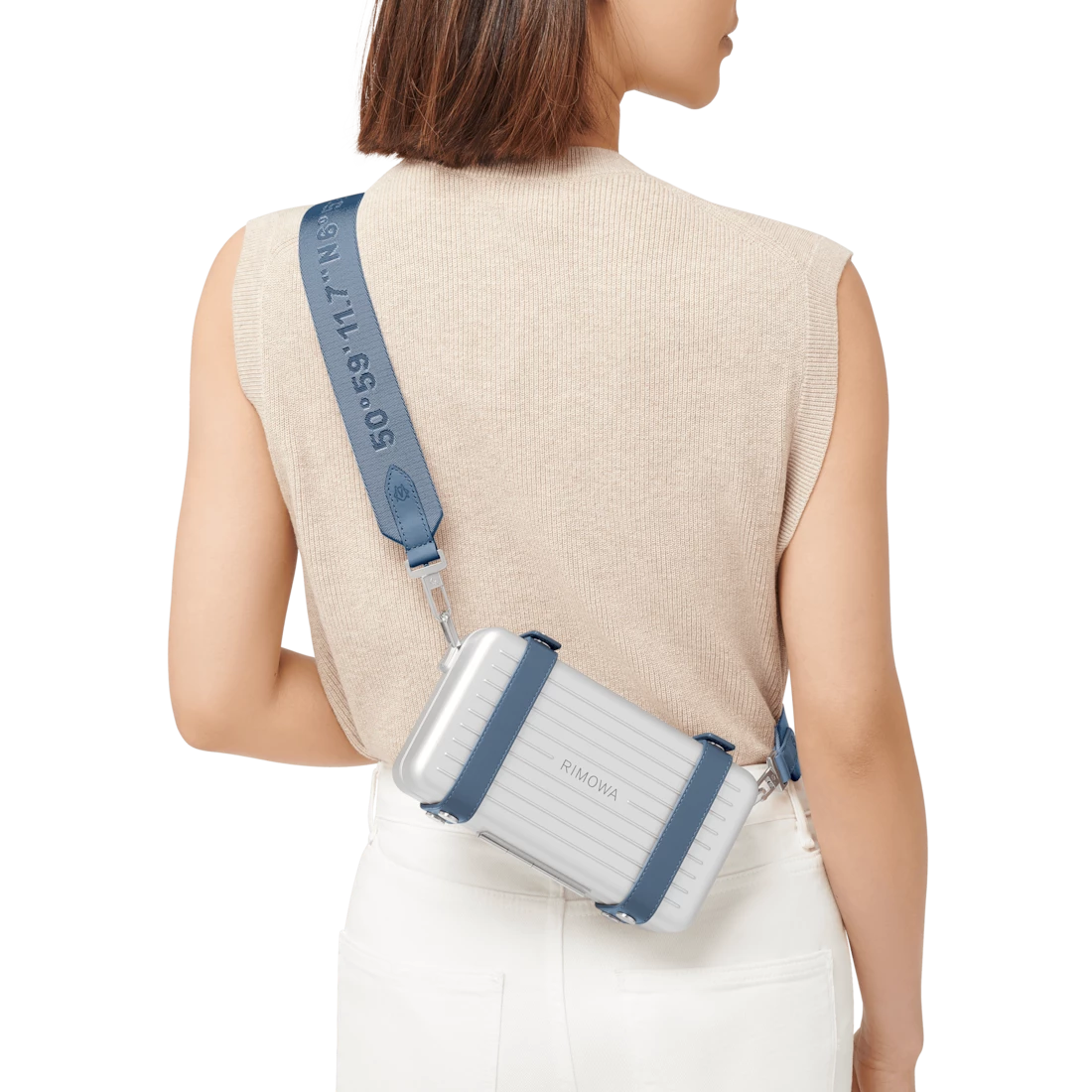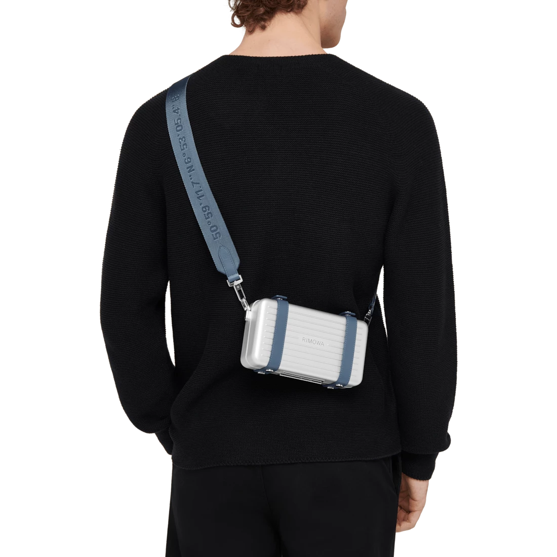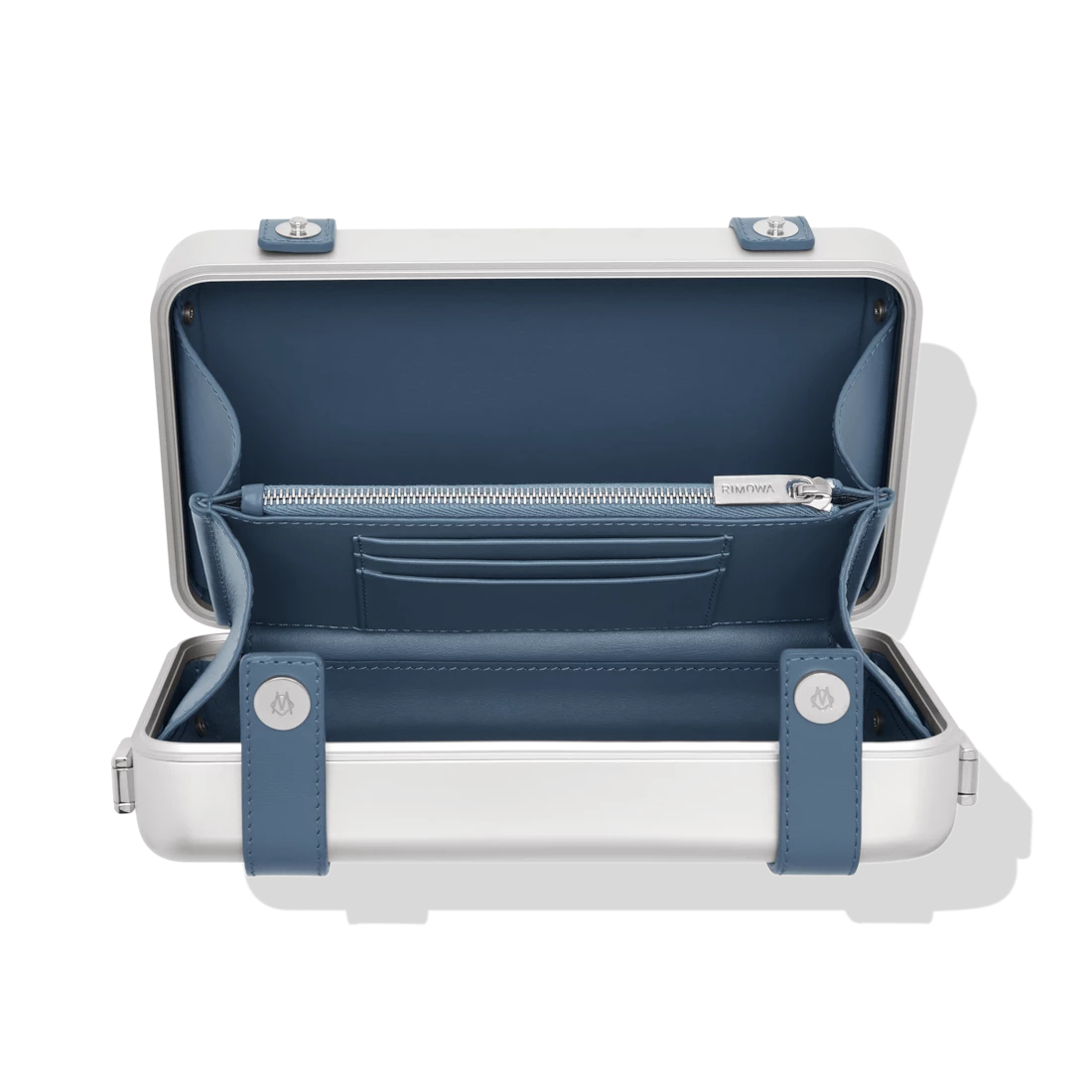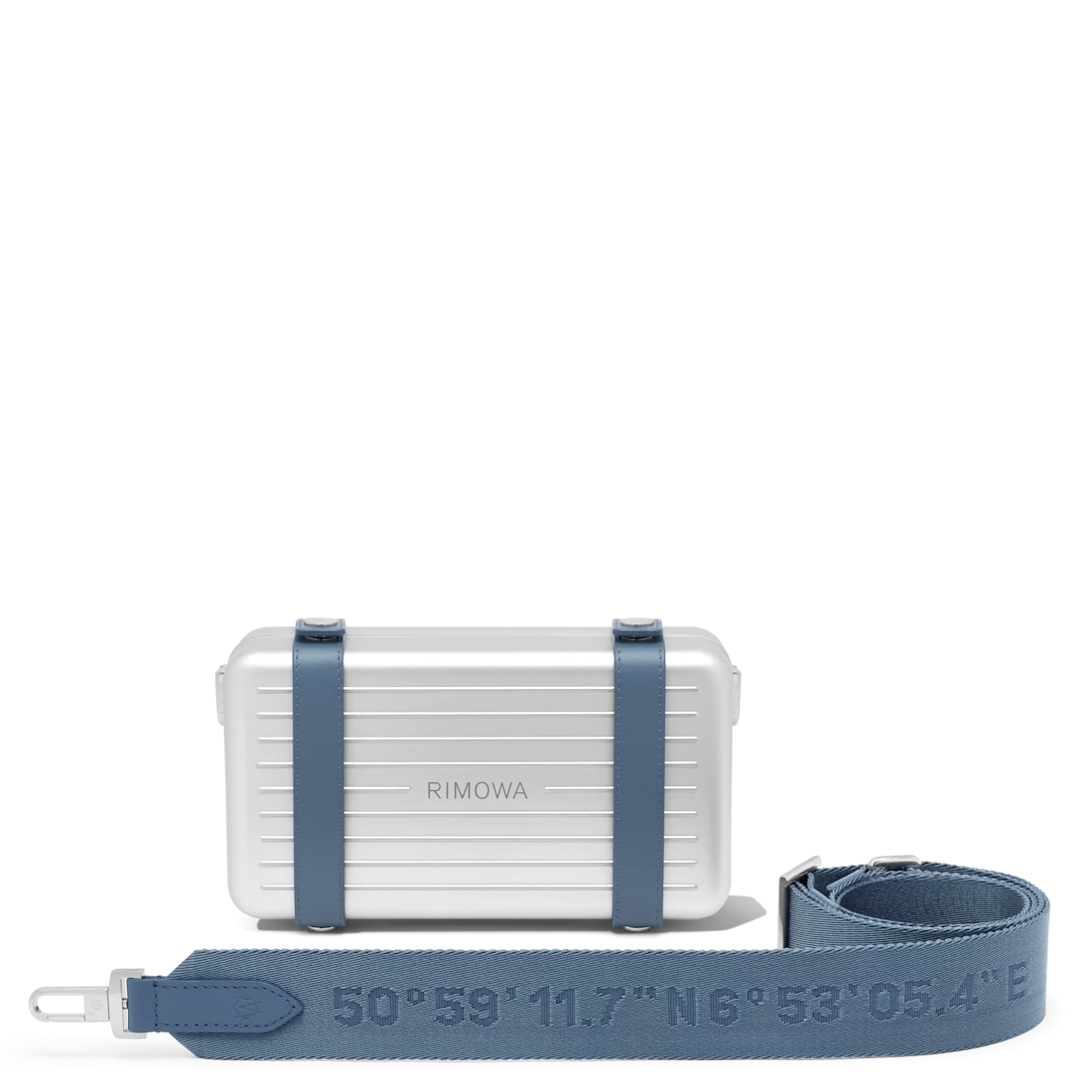 Each detail of the RIMOWA Personal Aluminium Cross-Body Bag in Silver and Arctic Blue is carefully considered, from its color-matched straps and lining in leather down to the metal rivets, rings, and hooks in a shiny palladium color. The interior features two open compartments, a zipped pocket, and 3 card slots.