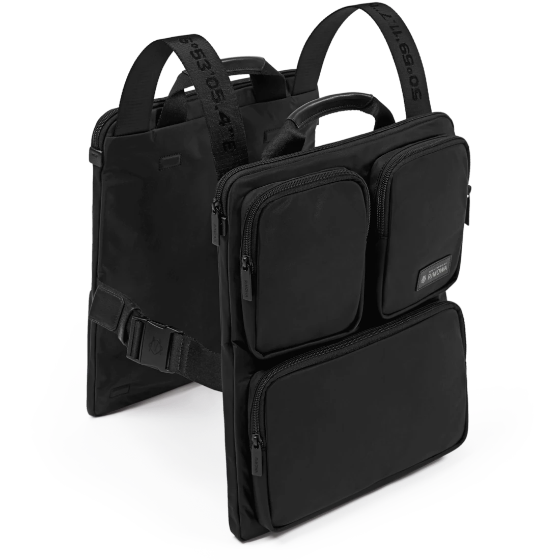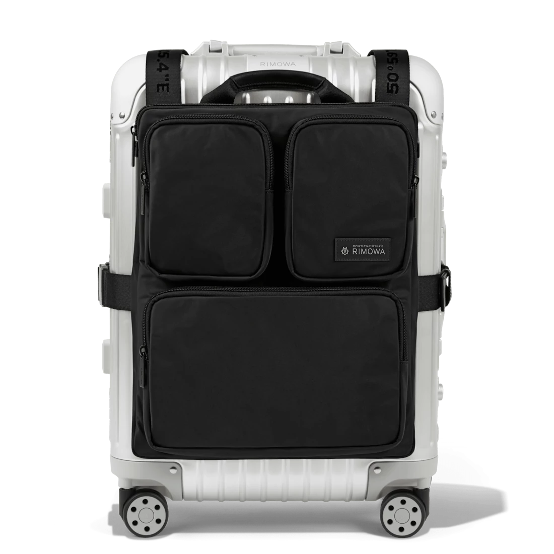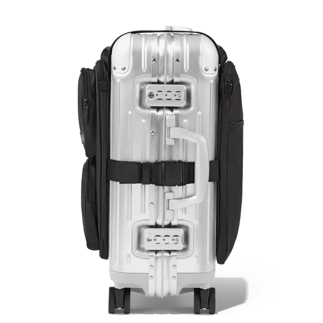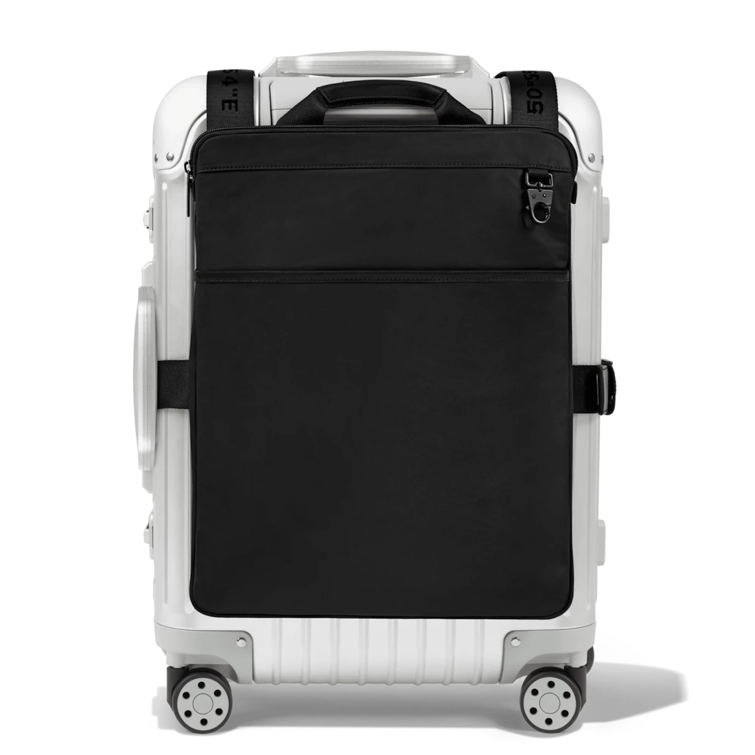 Conveniently secured to your RIMOWA Cabin suitcase using adjustable straps, it boasts a clever formation of pockets and compartments that offer easy access to your essentials such as phones, electronics and toiletry pouches. Two large zipped pockets can each fit a laptop of up to 16″ in size, or documents and magazines.