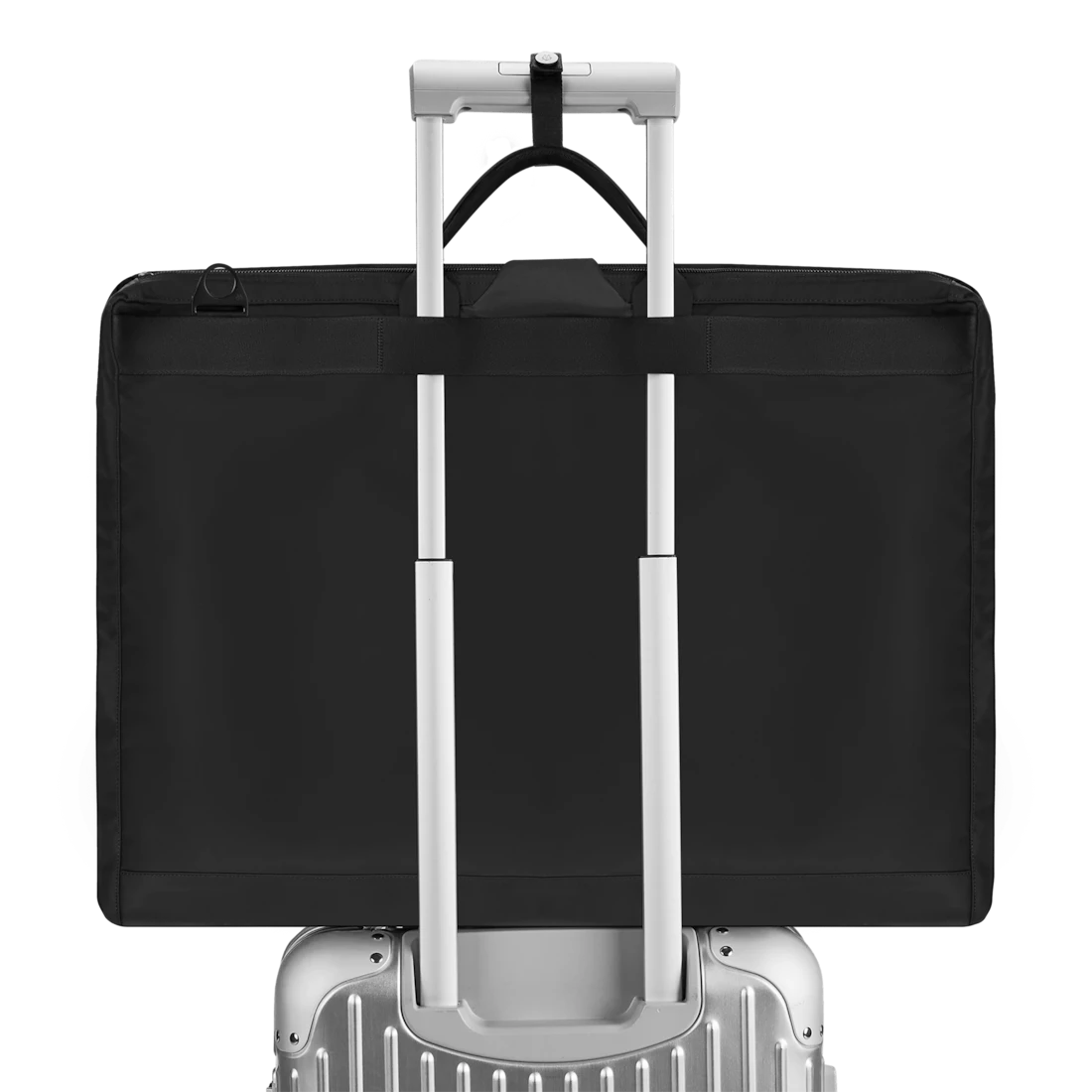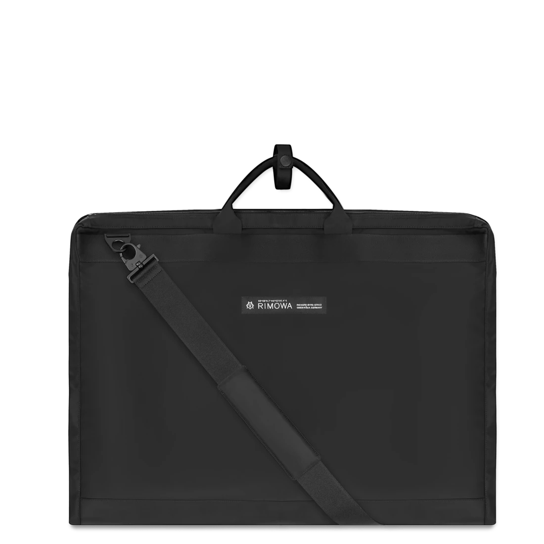 Folded in three parts and secured with three snap buttons. The bag’s interior features a large zipped compartment with three hanging loops made in webbing for added support, a custom made RIMOWA hanger, and a zipped mesh pocket for smaller items. Designed for traveling, the travel strap and hanging loop help secure the bag onto your suitcase and can be worn as either a hand or shoulder bag thanks to a removable padded shoulder strap.