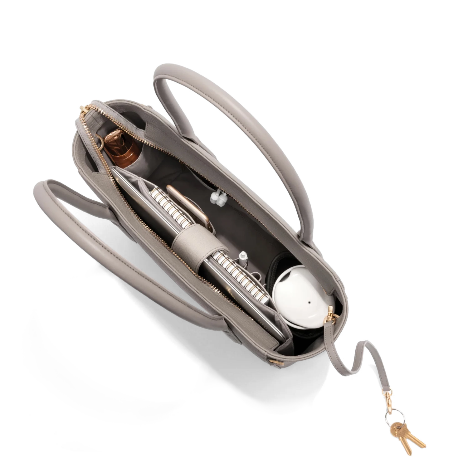 Like its full-sized counterpart, the Classic tote is made for the 7am-10pm lifestyle. It features the same clever construction but with a slimmer shape and fold-down handles for tighter situations (like balanced on your lap for the commute or tucked under your chair for cocktails). The roomy interior includes a padded compartment with a magnetic closure to keep a 13” laptop or tablet safe, while pockets hold your wallet, phone, metro card and lip balm in place. Plus, a detachable key leash keeps keys easily accessible and an oversized, brushed metal zipper allows you to effortlessly open and close your bag.