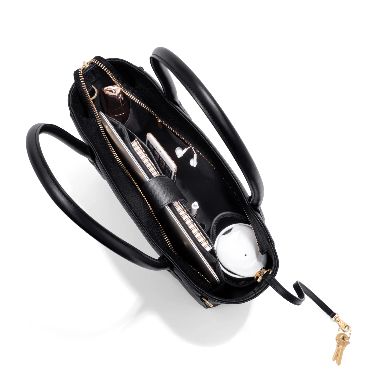 Like its full-sized counterpart, the Classic tote is made for the 7am-10pm lifestyle. It features the same clever construction but with a slimmer shape and fold-down handles for tighter situations (like balanced on your lap for the commute or tucked under your chair for cocktails). The roomy interior includes a padded compartment with a magnetic closure to keep a 13” laptop or tablet safe, while pockets hold your wallet, phone, metro card and lip balm in place. Plus, a detachable key leash keeps keys easily accessible and an oversized, brushed metal zipper allows you to effortlessly open and close your bag.