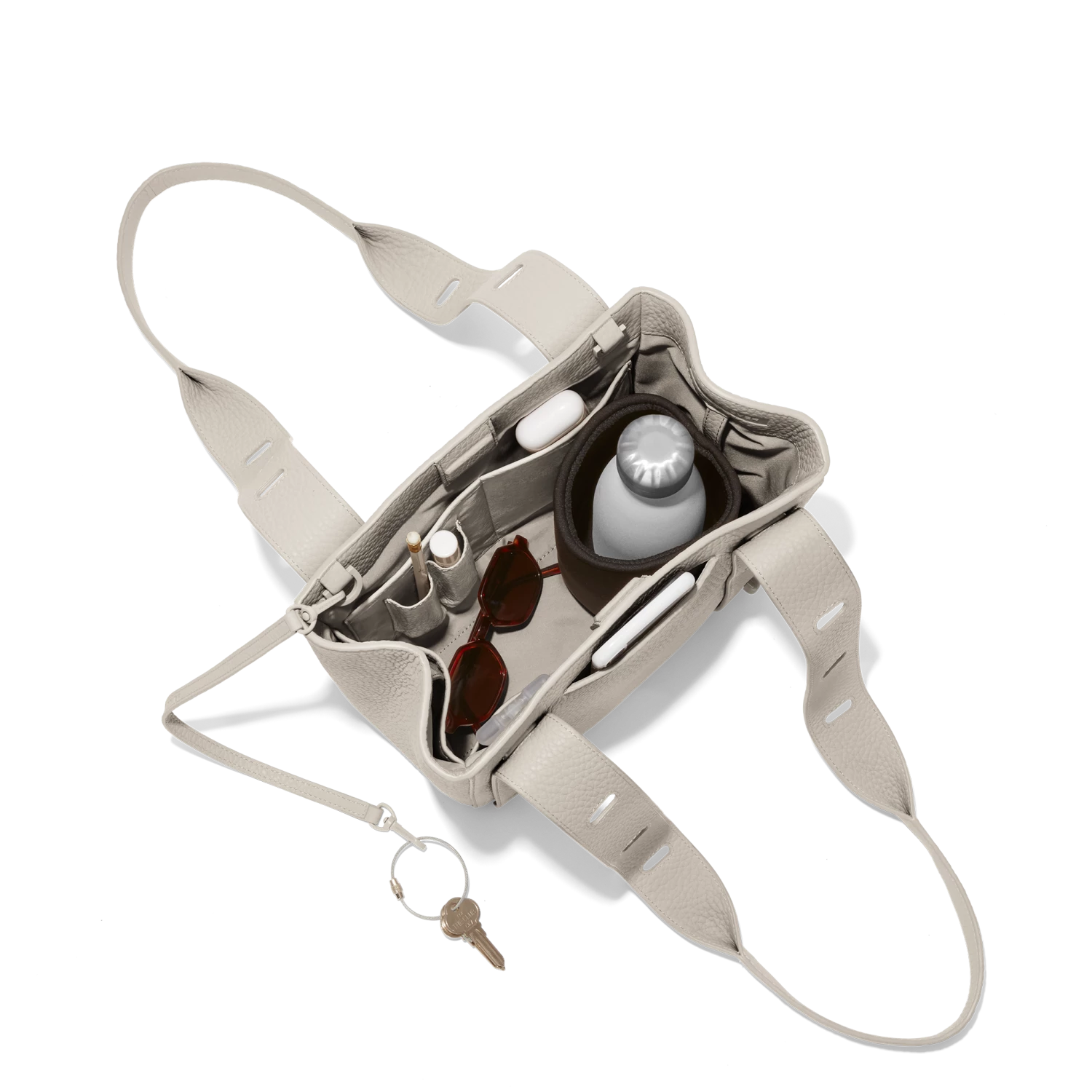 Its name was totes inspired by the magic and hustle of Tokyo. The Tokyo Turnlock Tote is perfect for a day (and night) in any city, including Tokyo. This leather handbag comes with 100% genuine pebbled leather adjustable length straps, perfect for those who want to carry it differently every day. While youre galavanting around the city, you might get a little thirsty, right? Right. In addition to a neoprene bottle holder, the Tokyo Turnlock also has five interior pockets in case you need to pack a snack too. And if you need your phone handy, just keep it in the exterior pocket. Oh, and dont think we forgot about the famous Dagne key leash. This soft leather handbag has that too. Wherever your day takes you, keep your adventuring cute.